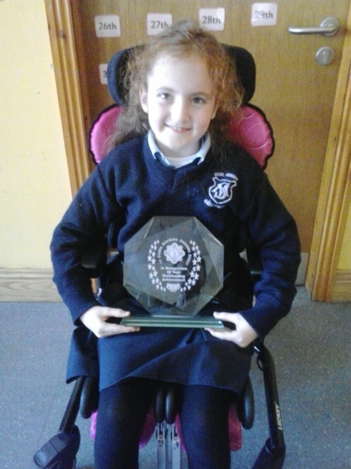 Huge congratulations to Abi in First Class who was presented with this fabulous award for her outstanding bravery. The Gardaí presented this award to Abi in recognition of all her achievements over the last number of years. We are very proud of her.