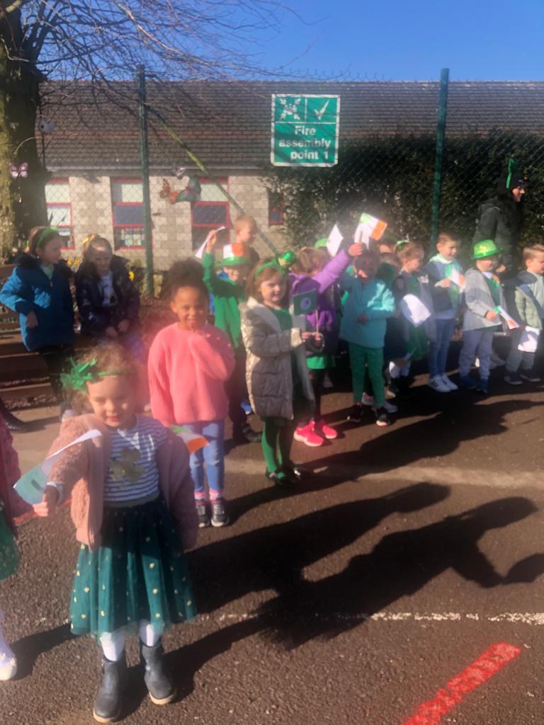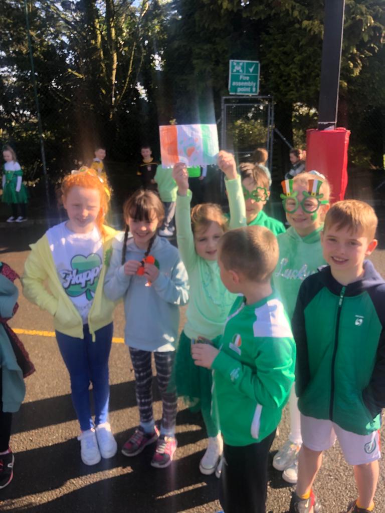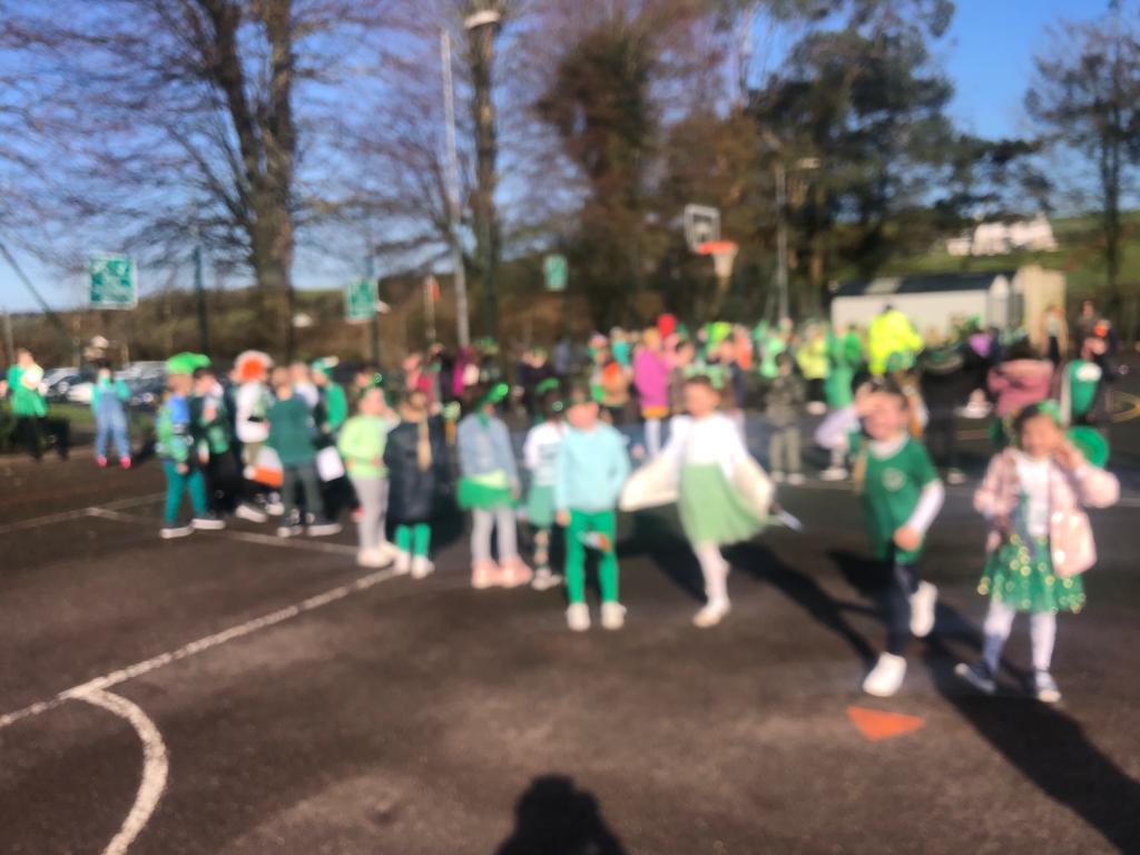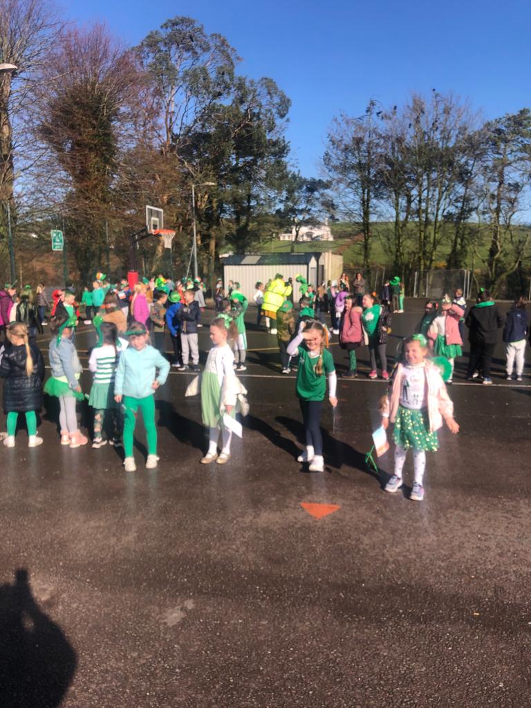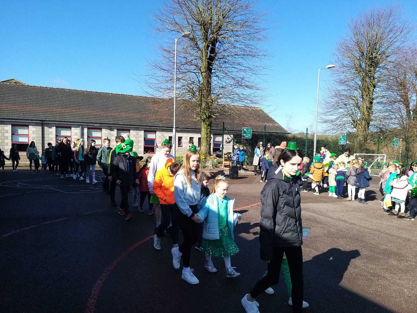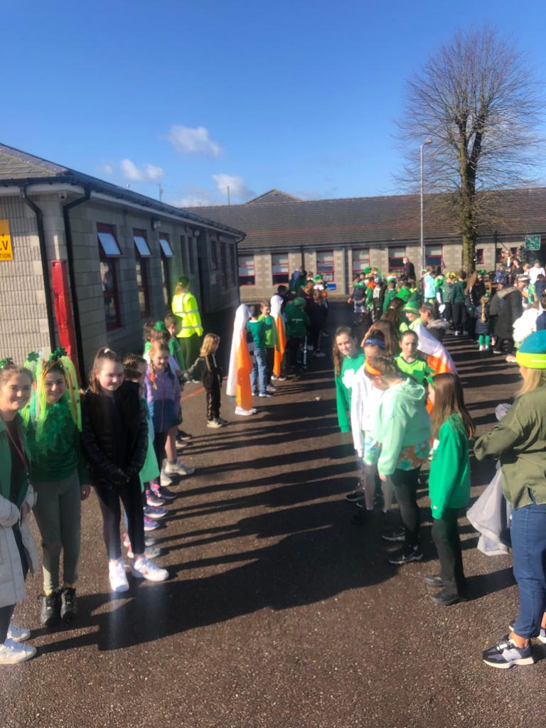Bhí lá iontach againn inniu ag céiliúradh Lá Fhéile Pádraig. There were great scenes around the school today as we pulled out all the stops to celebrate our Irish language, music, dance and song. The parade through the school grounds was a wonderful start to our celebrations. The céilí was thar barr and we finished off with a rousing renditon of Amhrán na bhFiann.