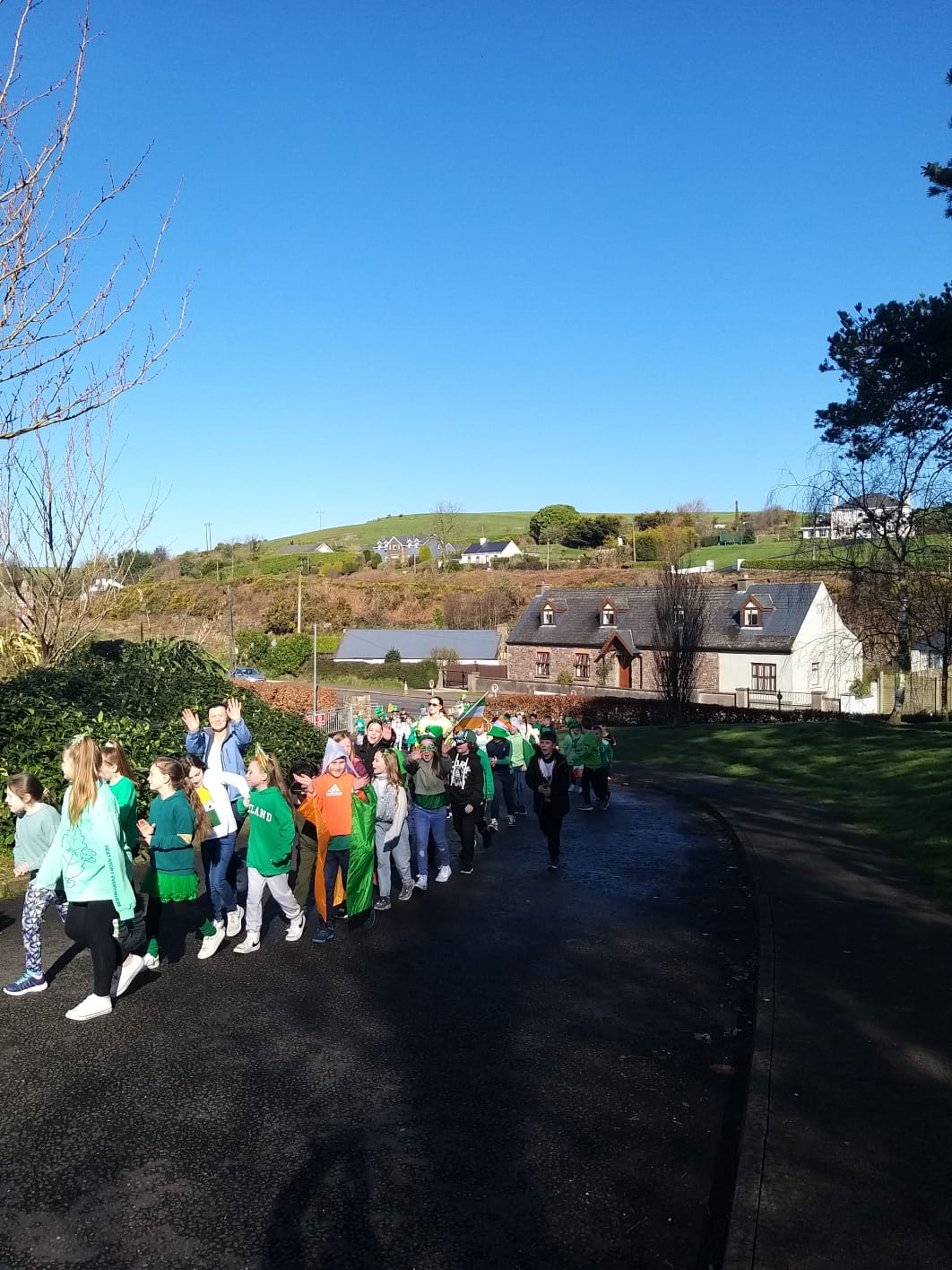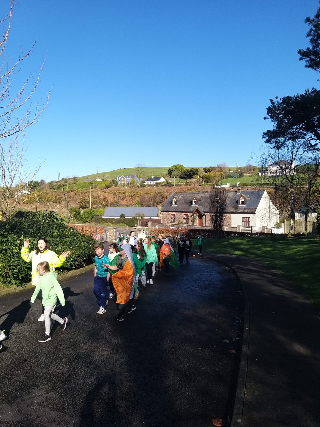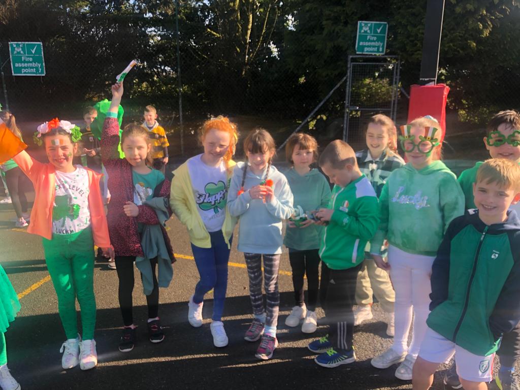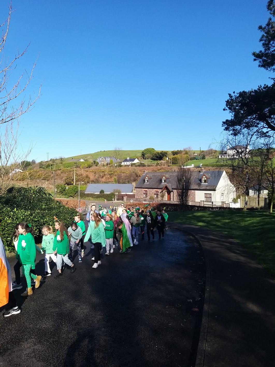 Bhí lá iontach againn inniu ag céiliúradh Lá Fhéile Pádraig. There were great scenes around the school today as we pulled out all the stops to celebrate our Irish language, music, dance and song. The parade through the school grounds was a wonderful start to our celebrations. The céilí was thar barr and we finished off with a rousing renditon of Amhrán na bhFiann.