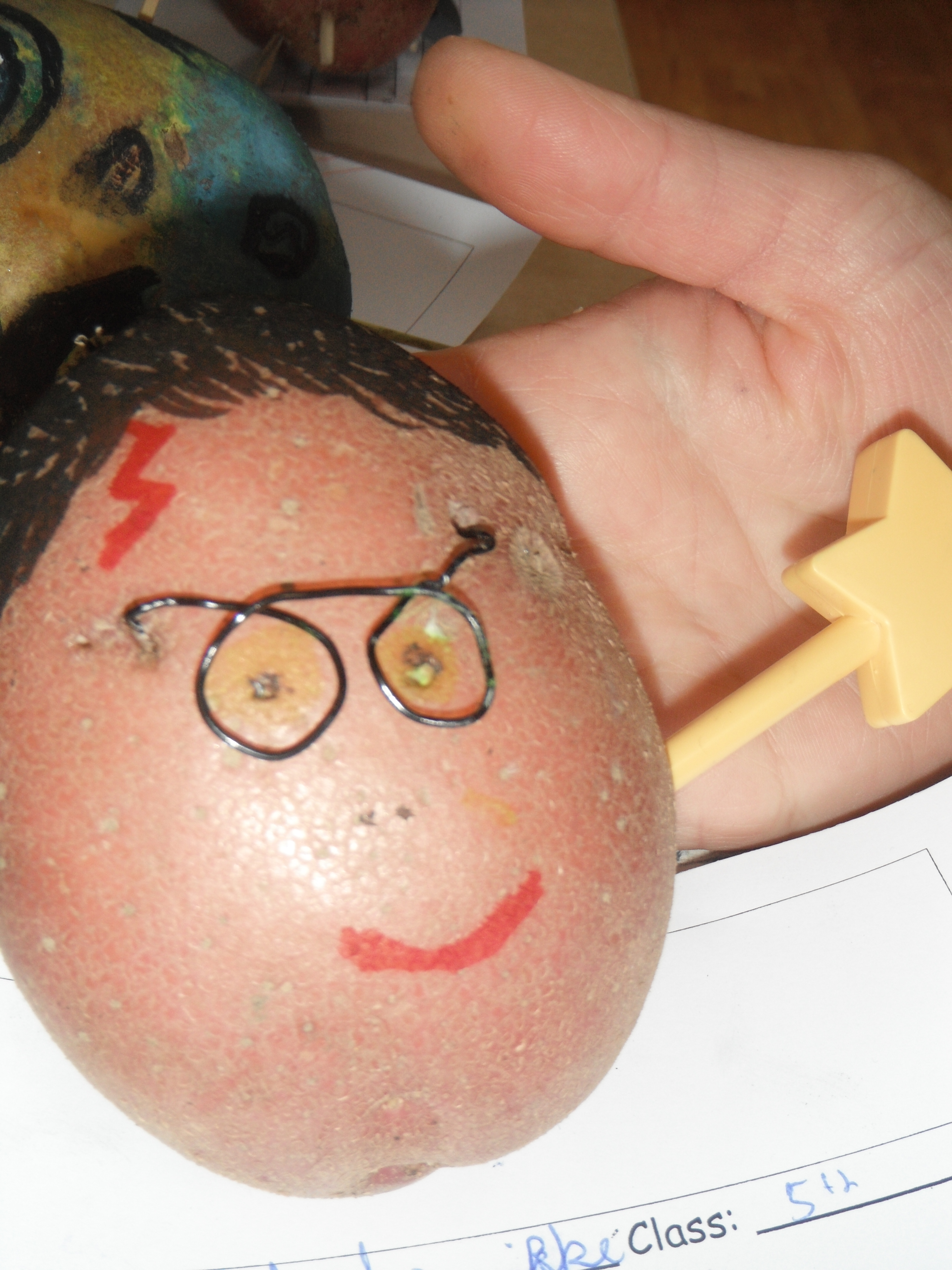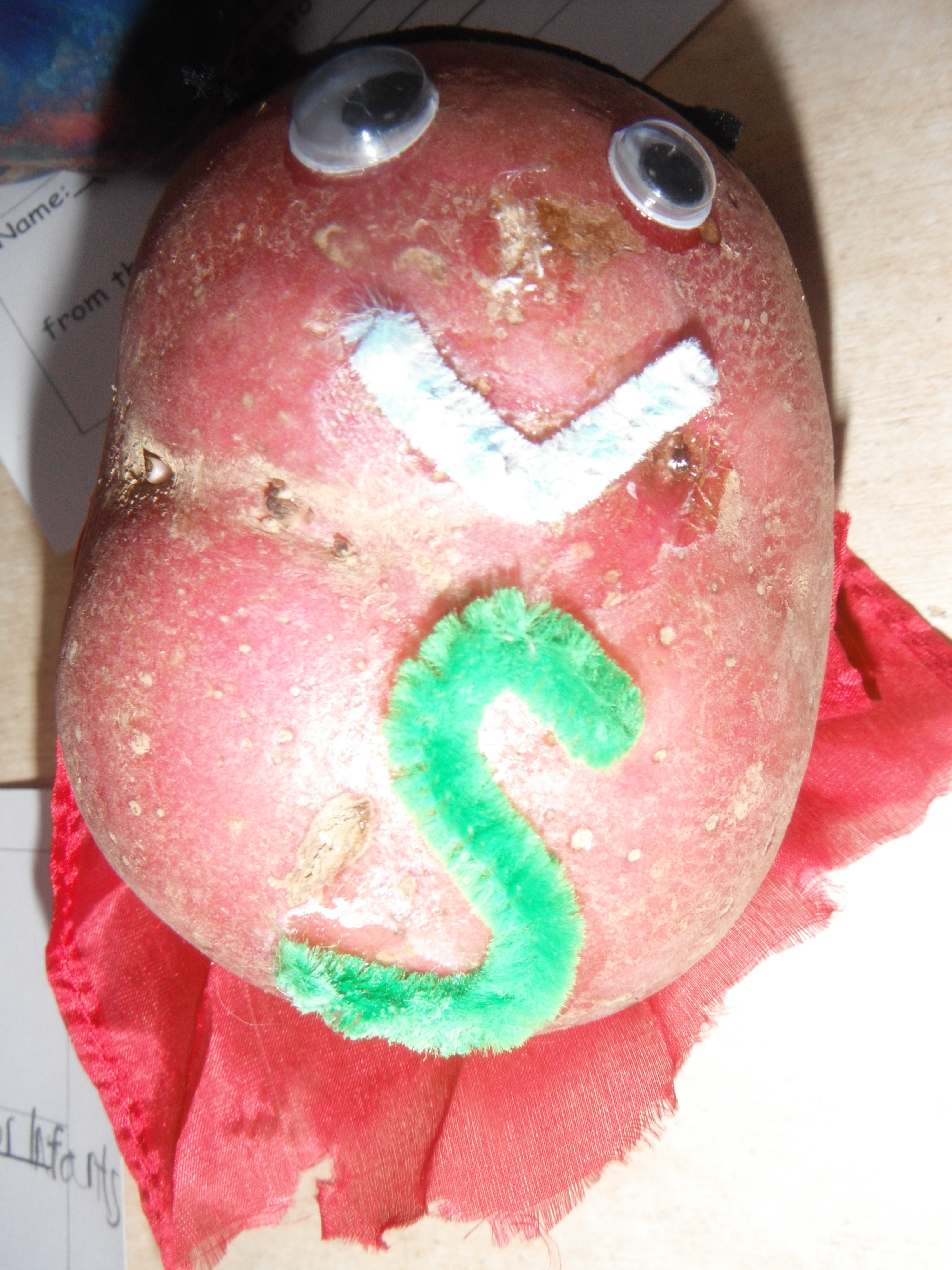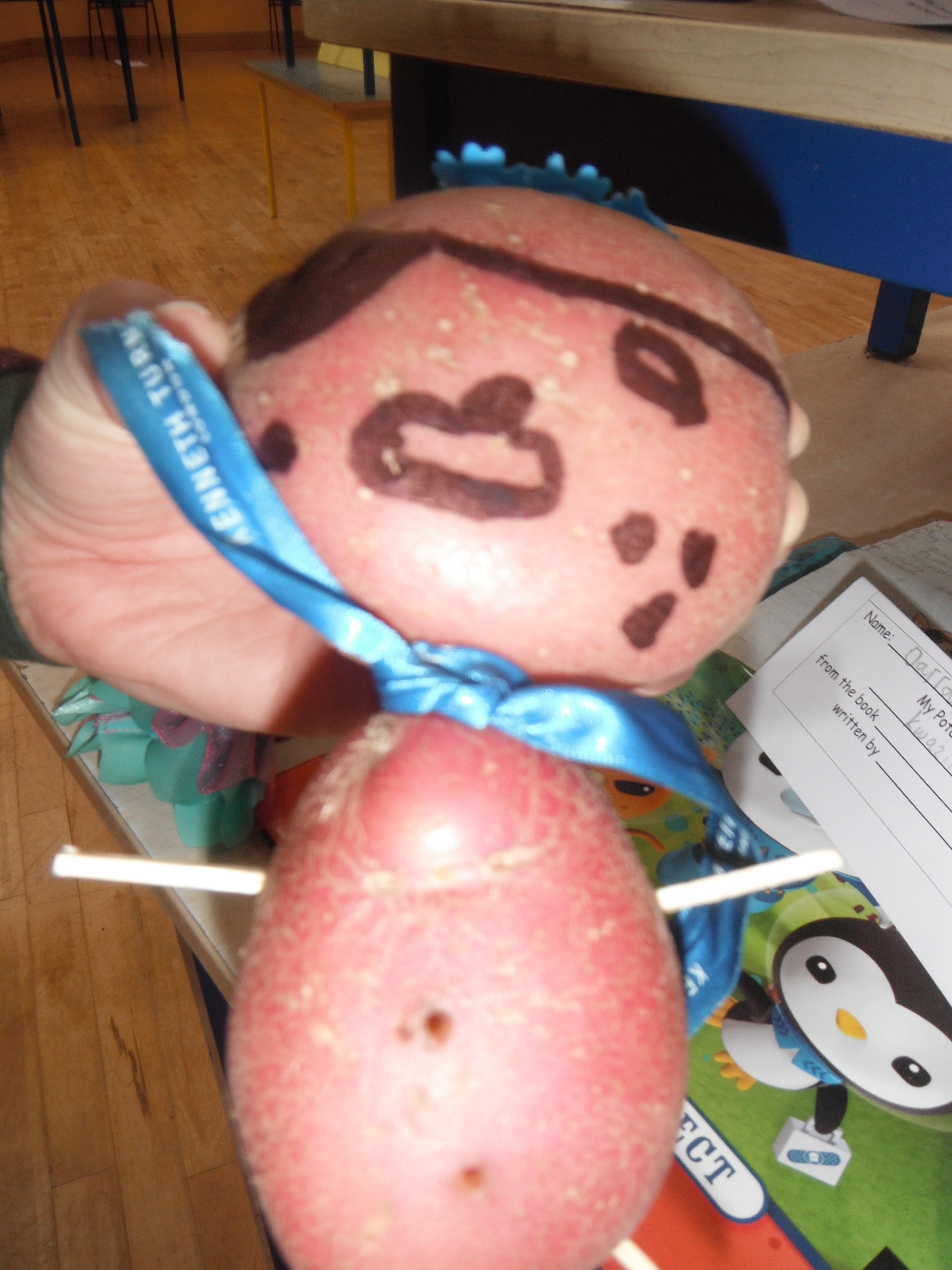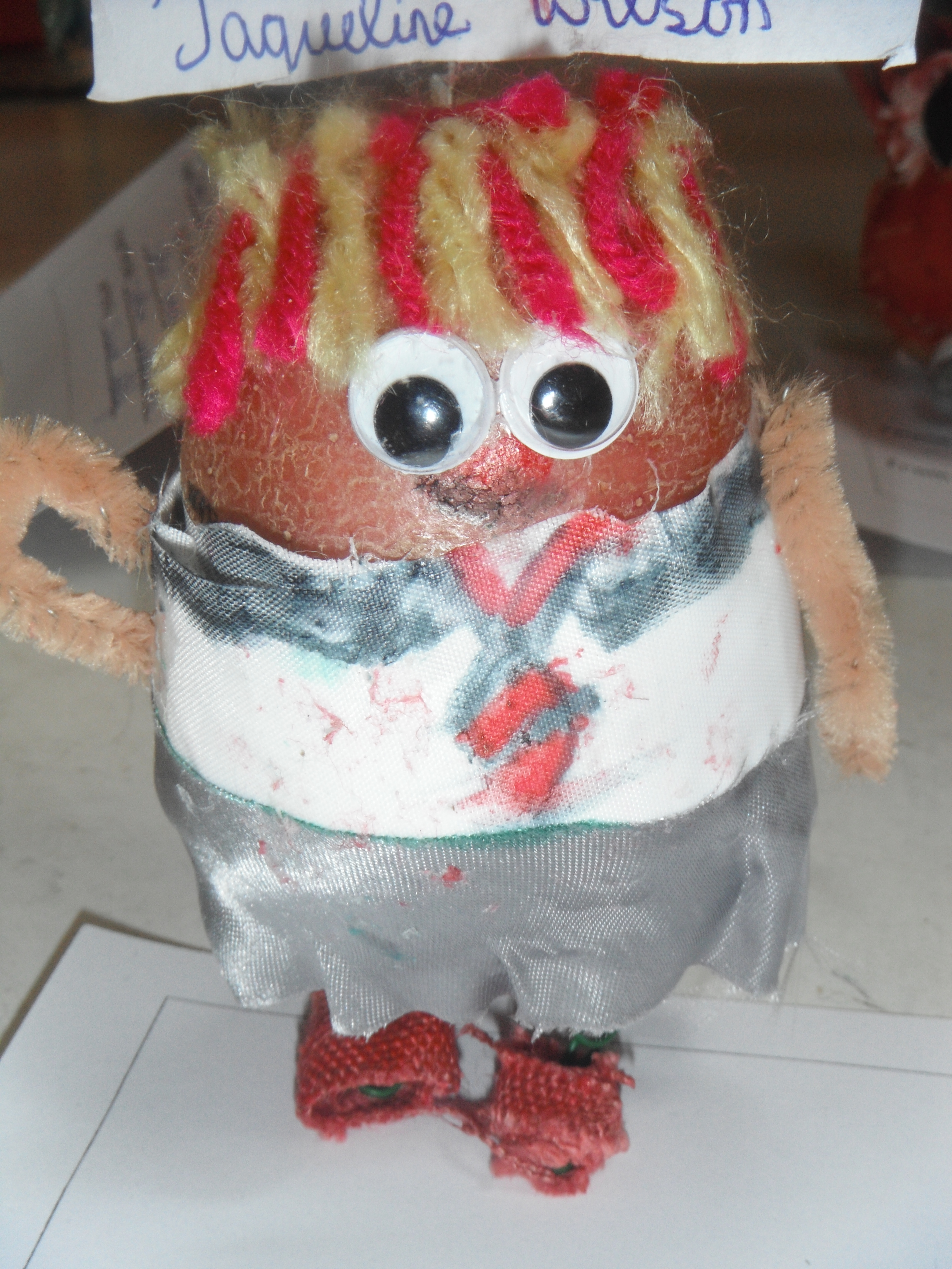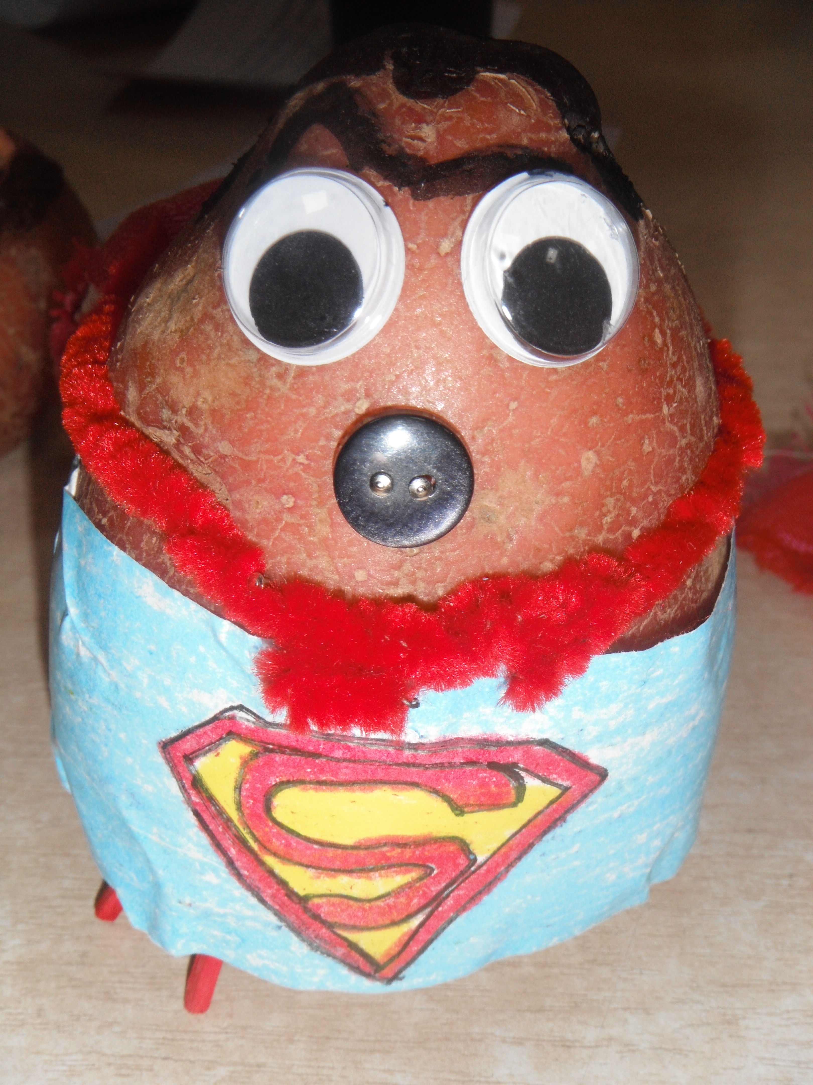 These are photographs of the fantastic potato head characters that children made this weekend and brought to school on Monday. All of the potato heads were made to resemble characters from a book. We had characters from fairytales, autobiographies, comic books and children’s novels. The display in the hall on Monday afternoon was wonderful. Every single potato head designer deserves a huge ‘WELL DONE!’ because these potatoes are absolutely amazing! Have a look…
