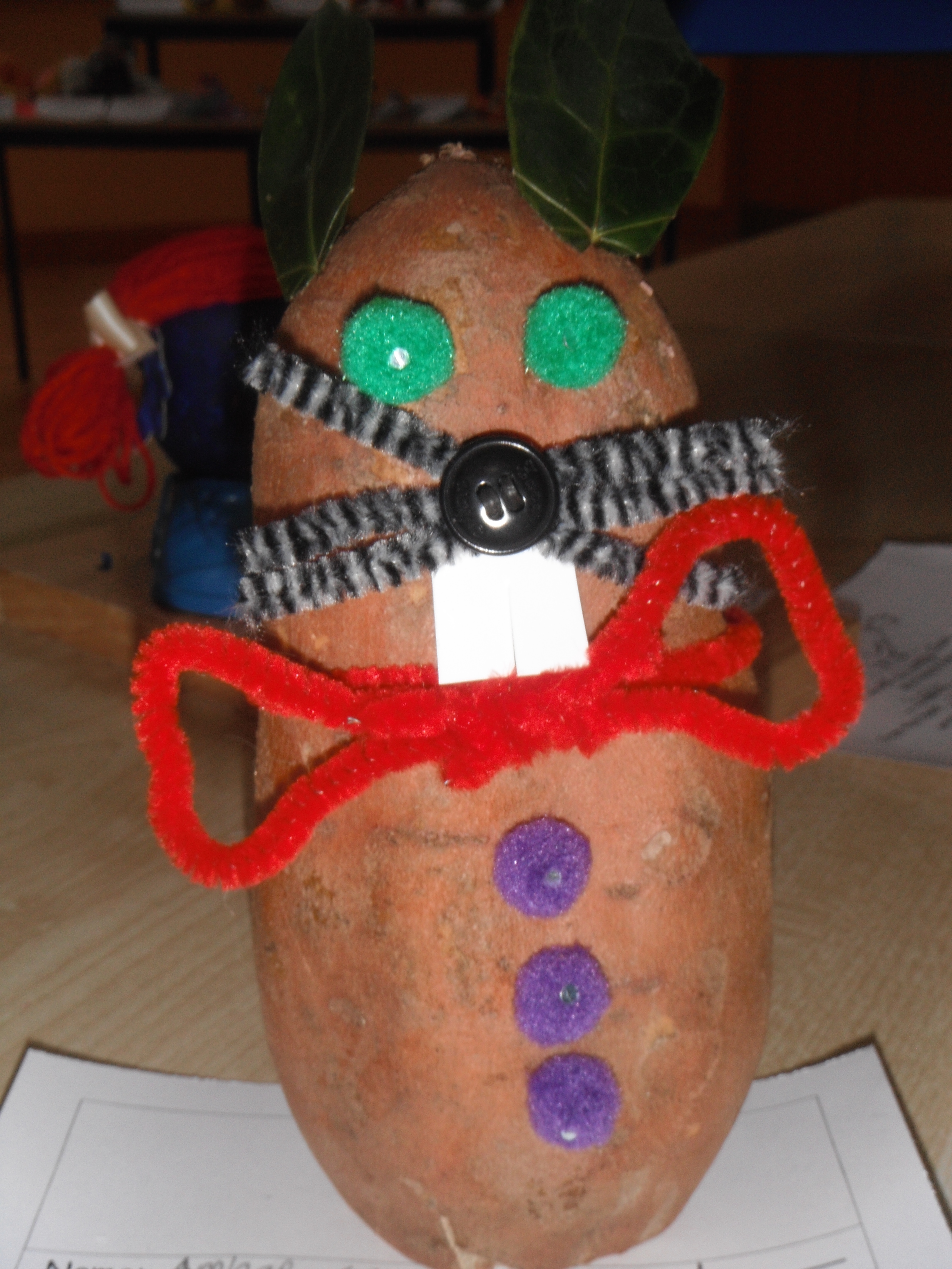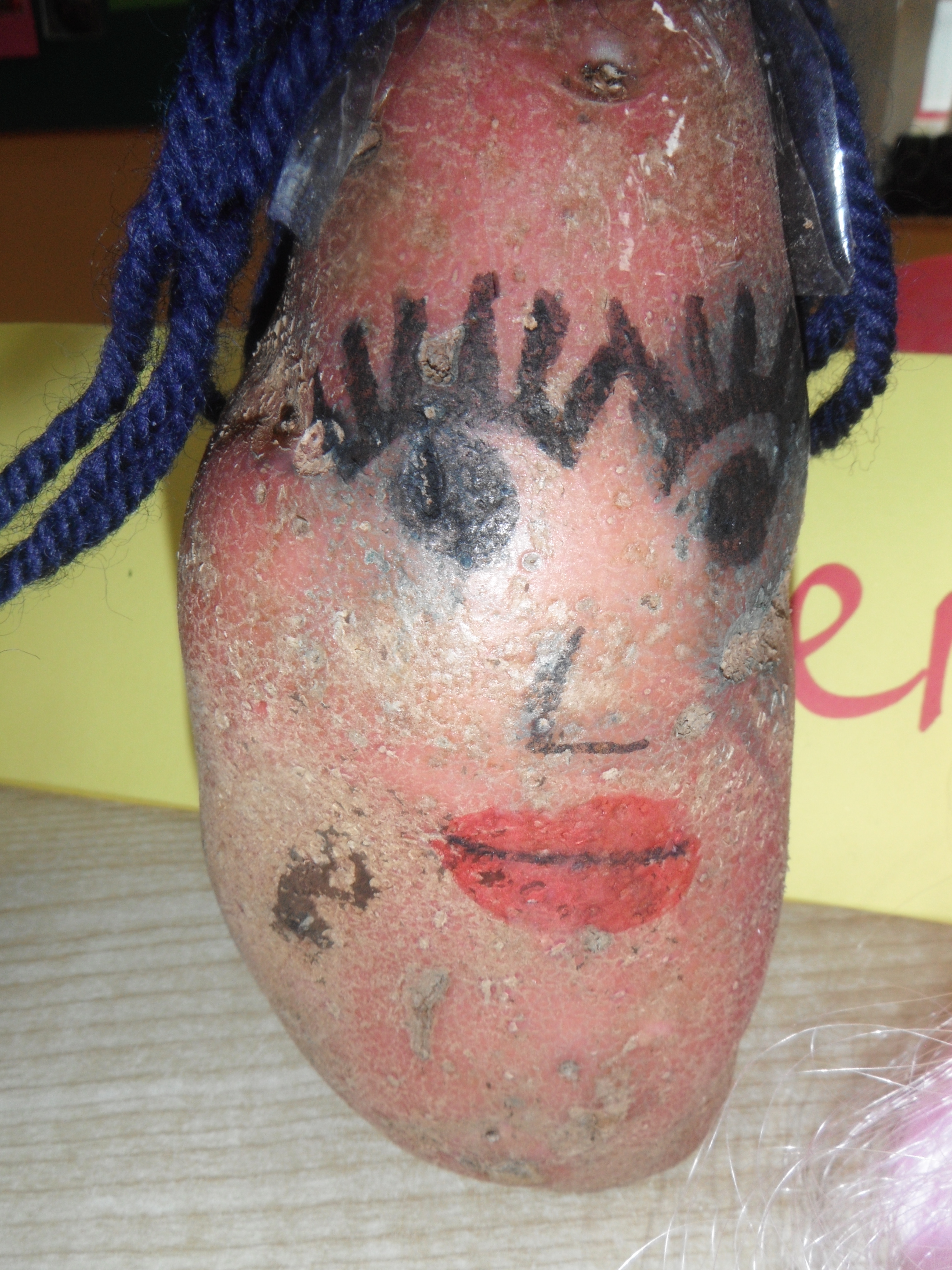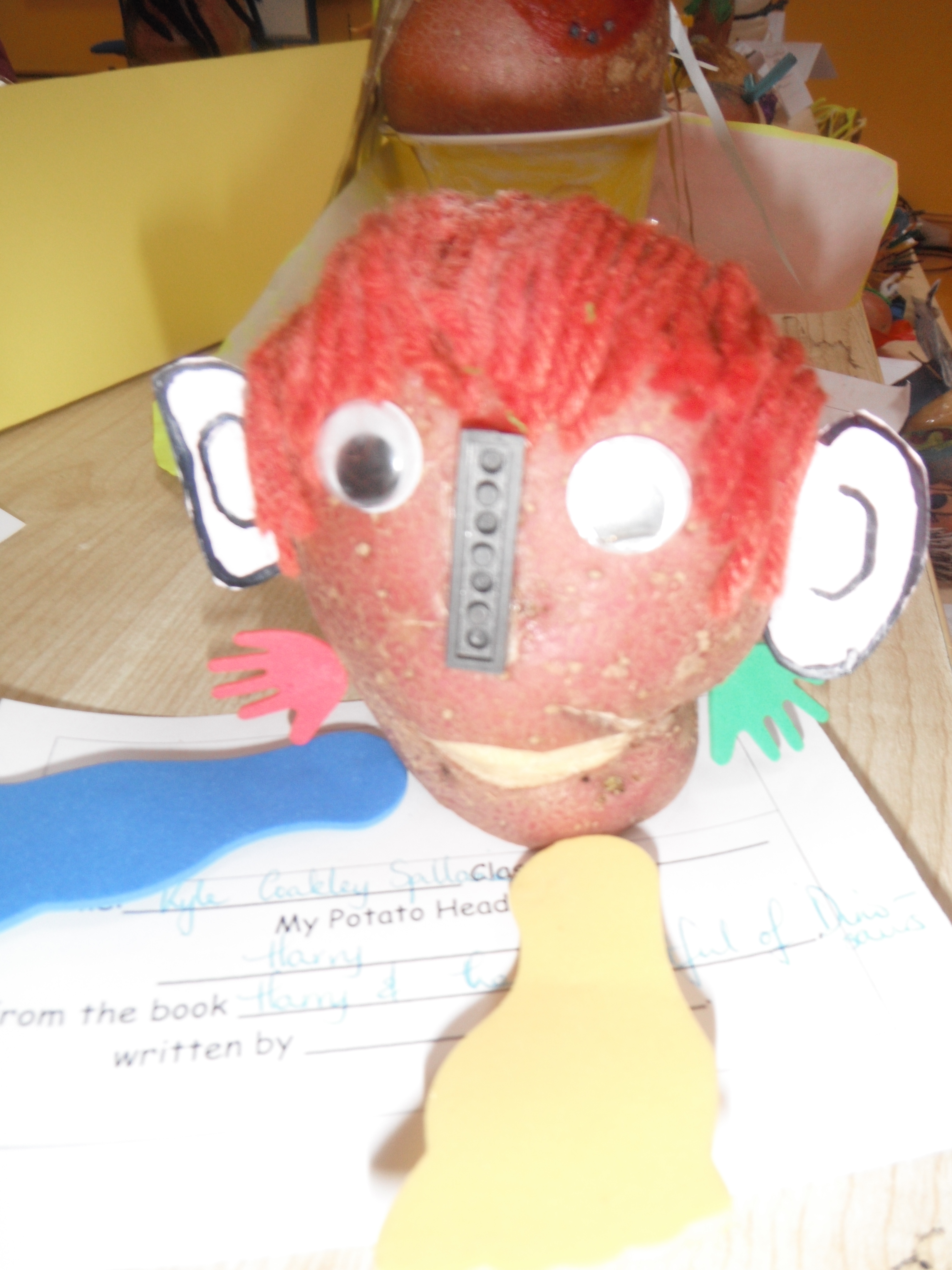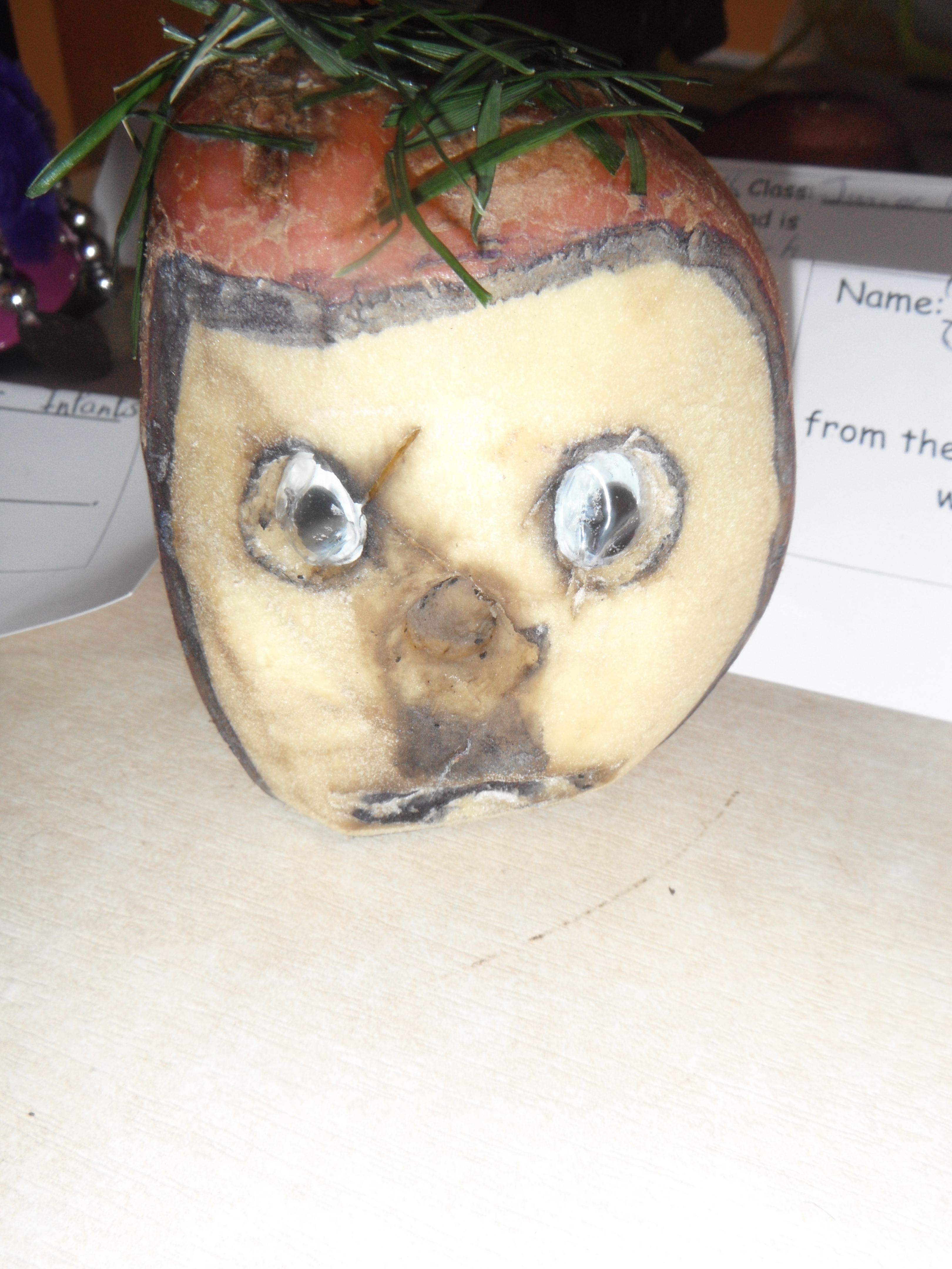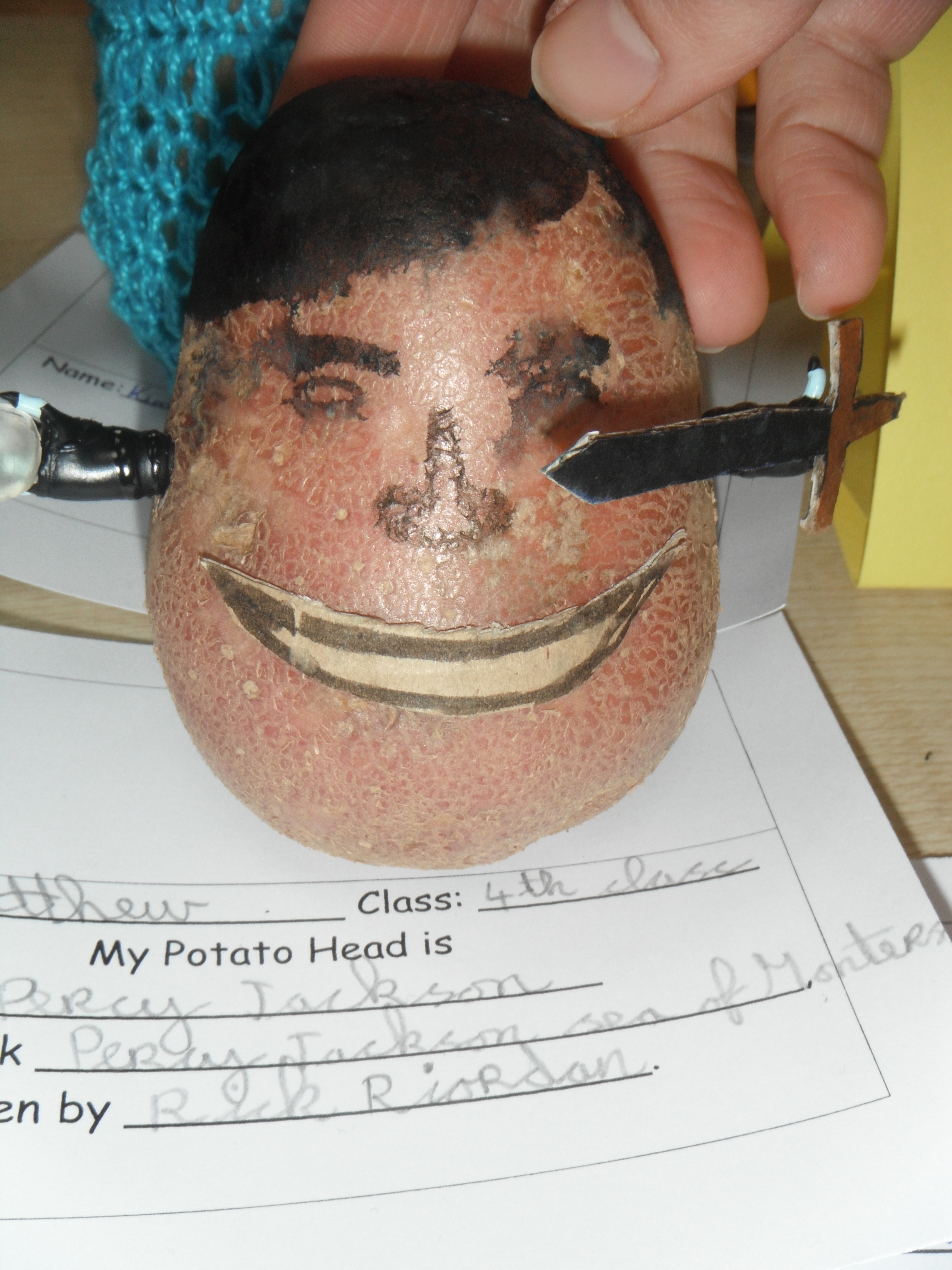 These are photographs of the fantastic potato head characters that children made this weekend and brought to school on Monday. All of the potato heads were made to resemble characters from a book. We had characters from fairytales, autobiographies, comic books and children’s novels. The display in the hall on Monday afternoon was wonderful. Every single potato head designer deserves a huge ‘WELL DONE!’ because these potatoes are absolutely amazing! Have a look…