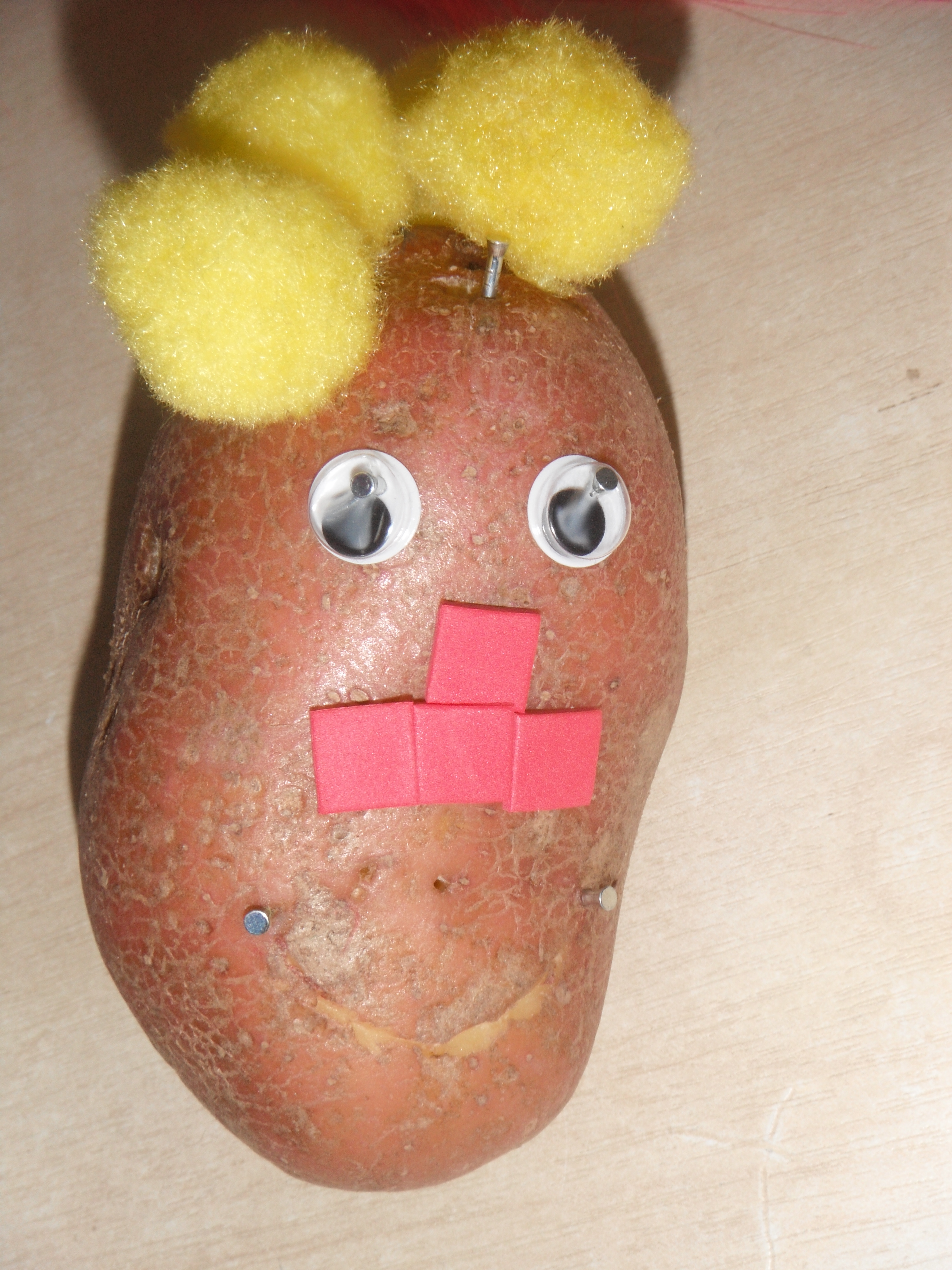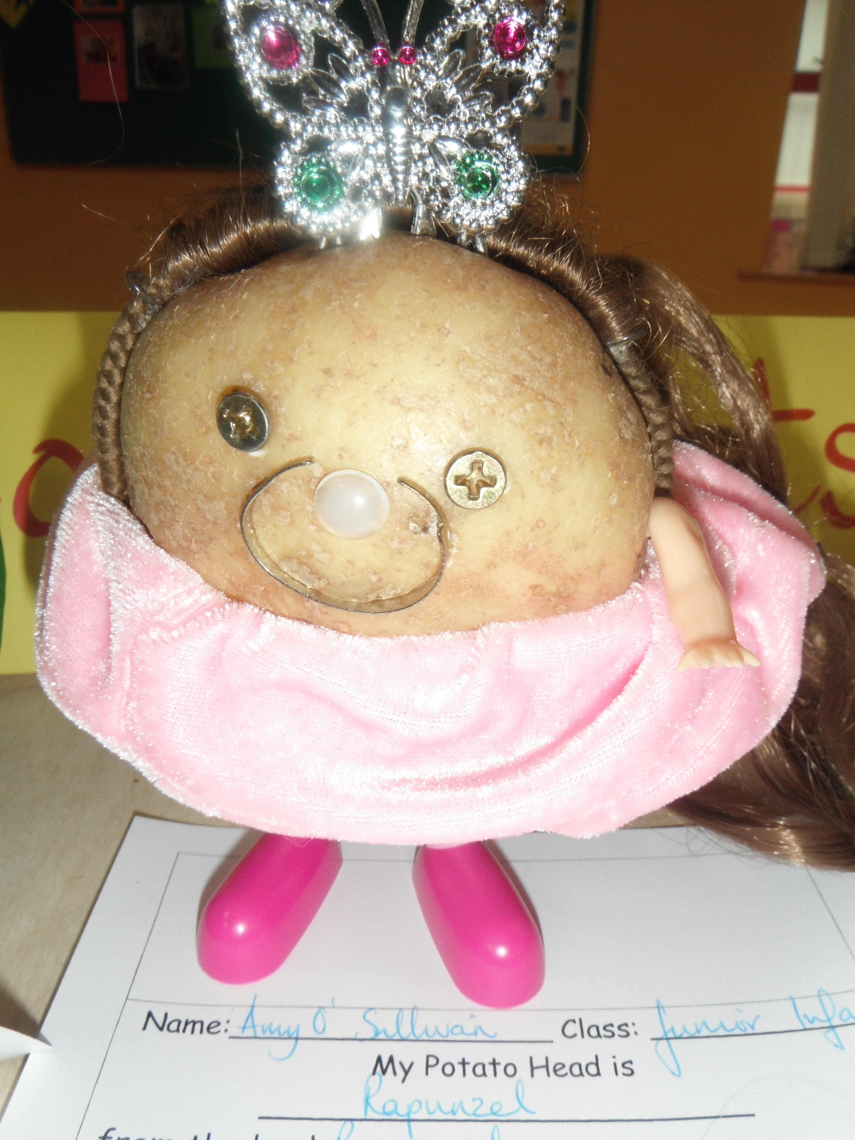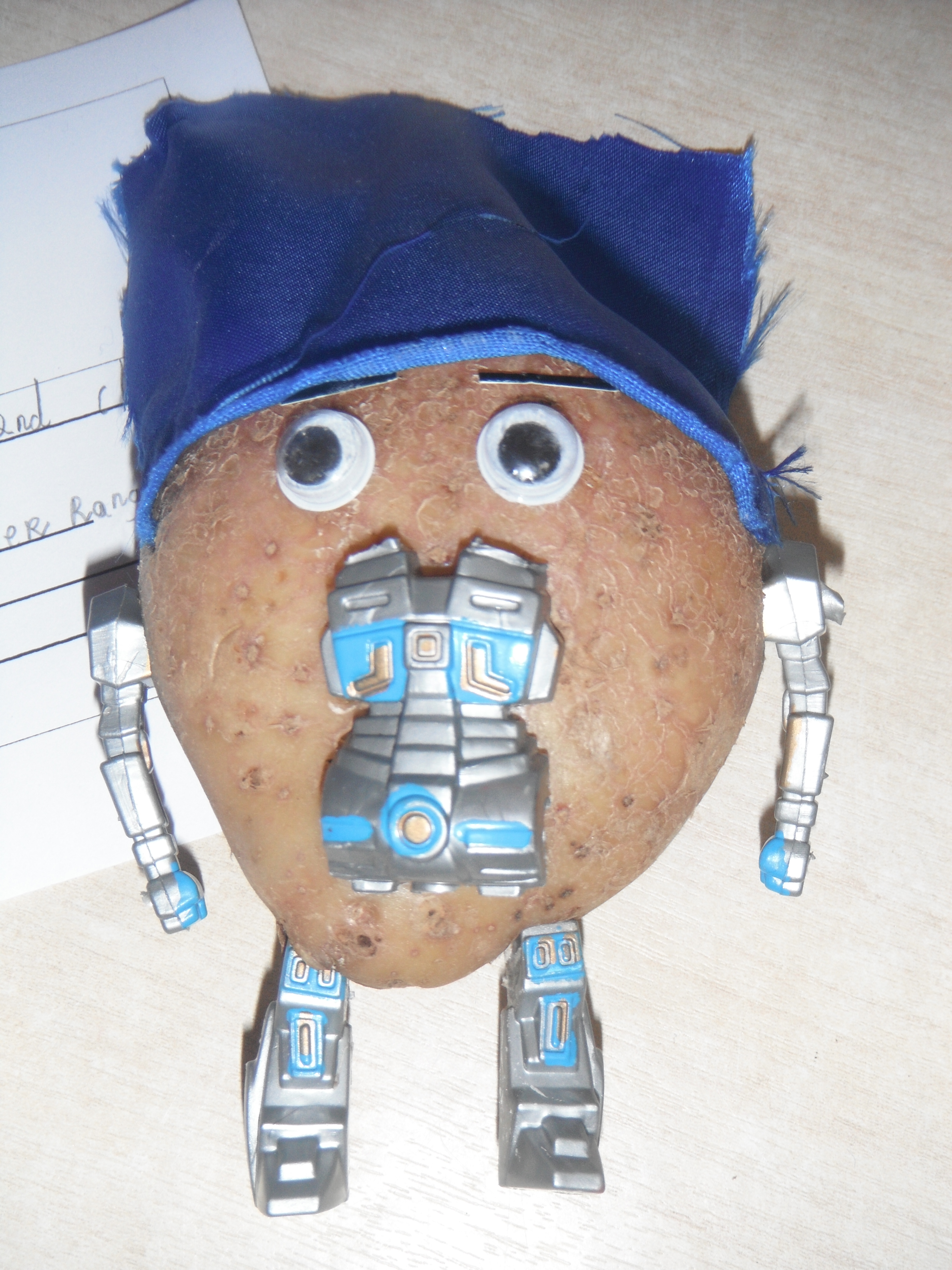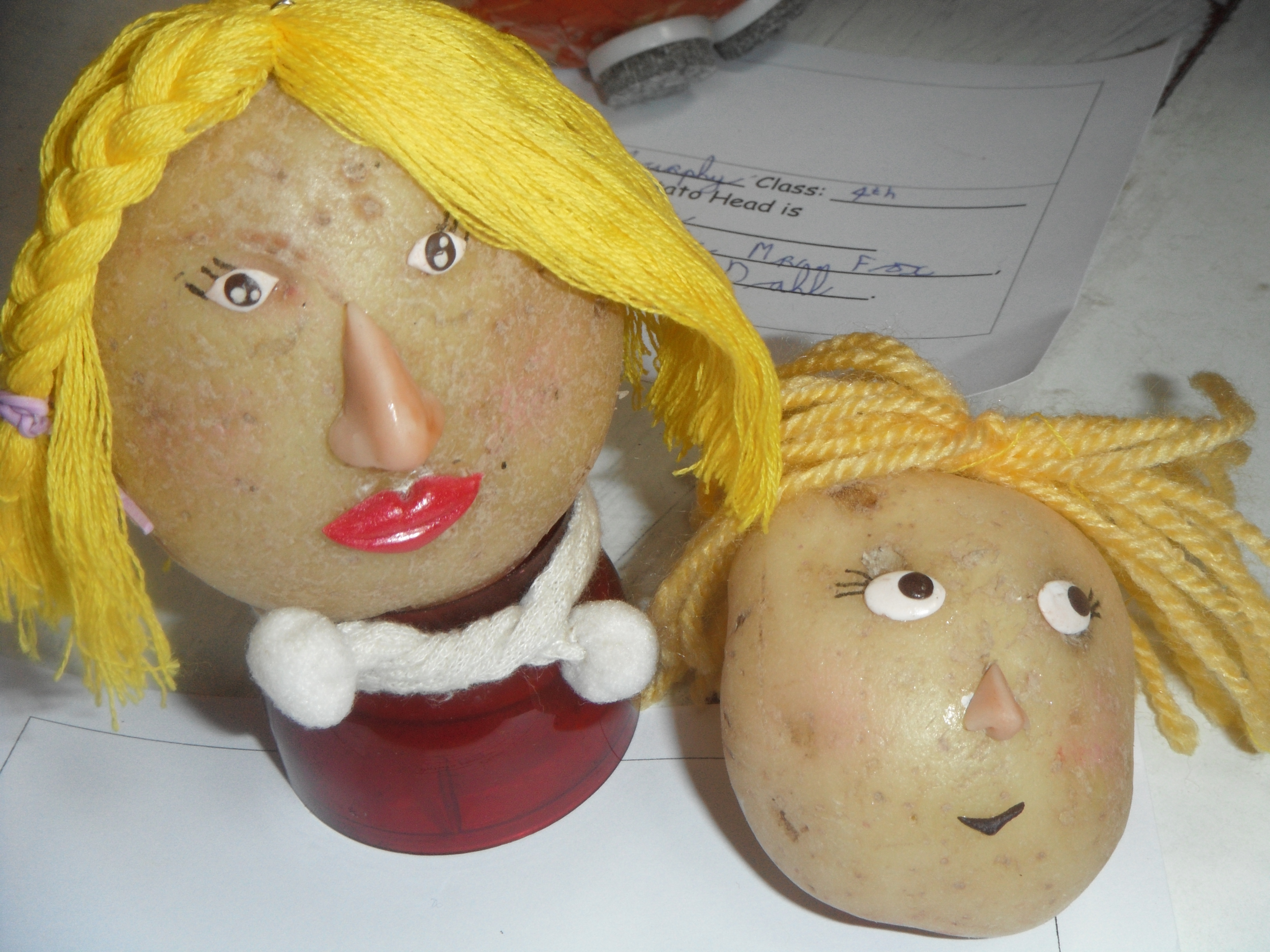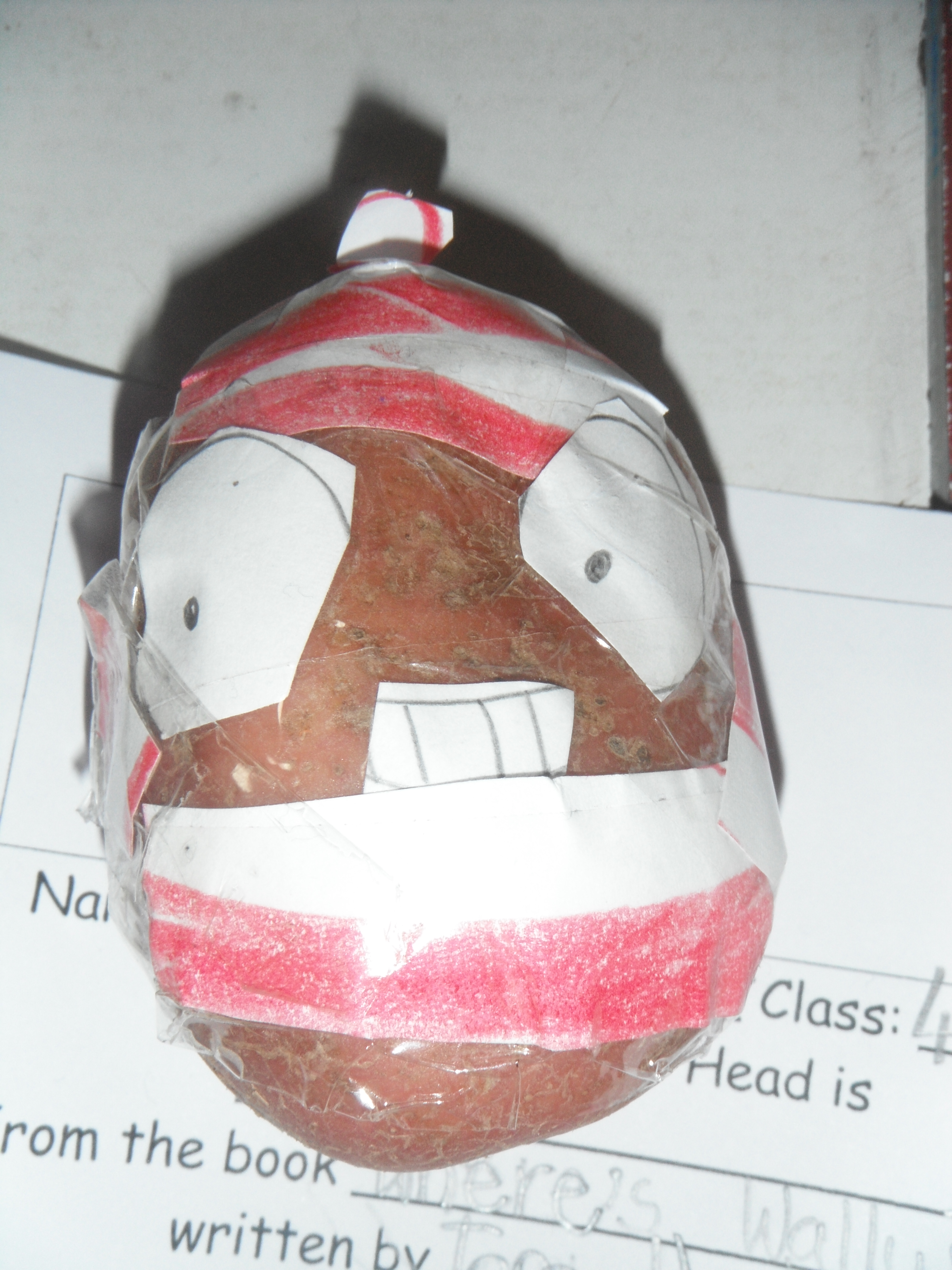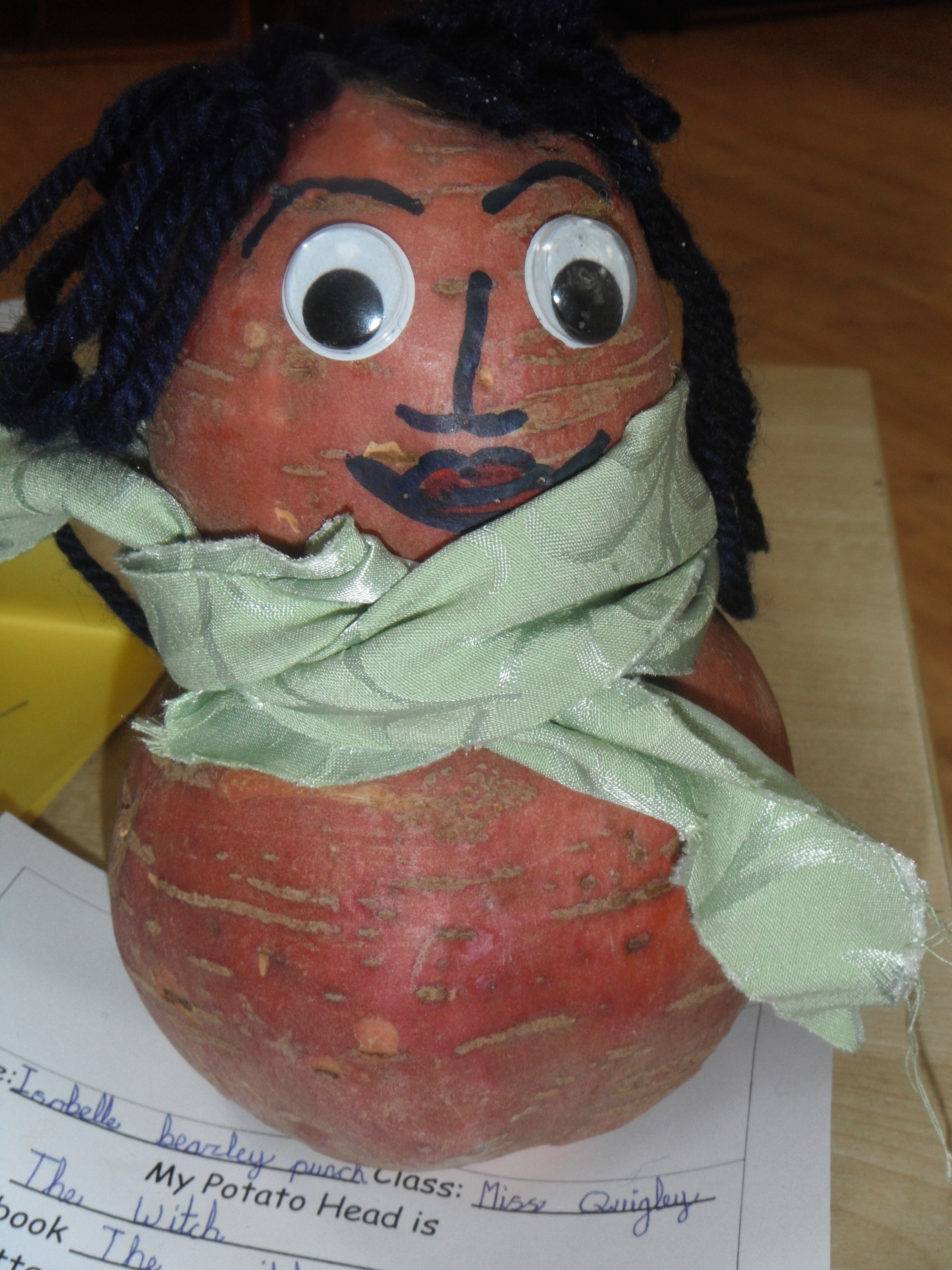 These are photographs of the fantastic potato head characters that children made this weekend and brought to school on Monday. All of the potato heads were made to resemble characters from a book. We had characters from fairytales, autobiographies, comic books and children’s novels. The display in the hall on Monday afternoon was wonderful. Every single potato head designer deserves a huge ‘WELL DONE!’ because these potatoes are absolutely amazing! Have a look…