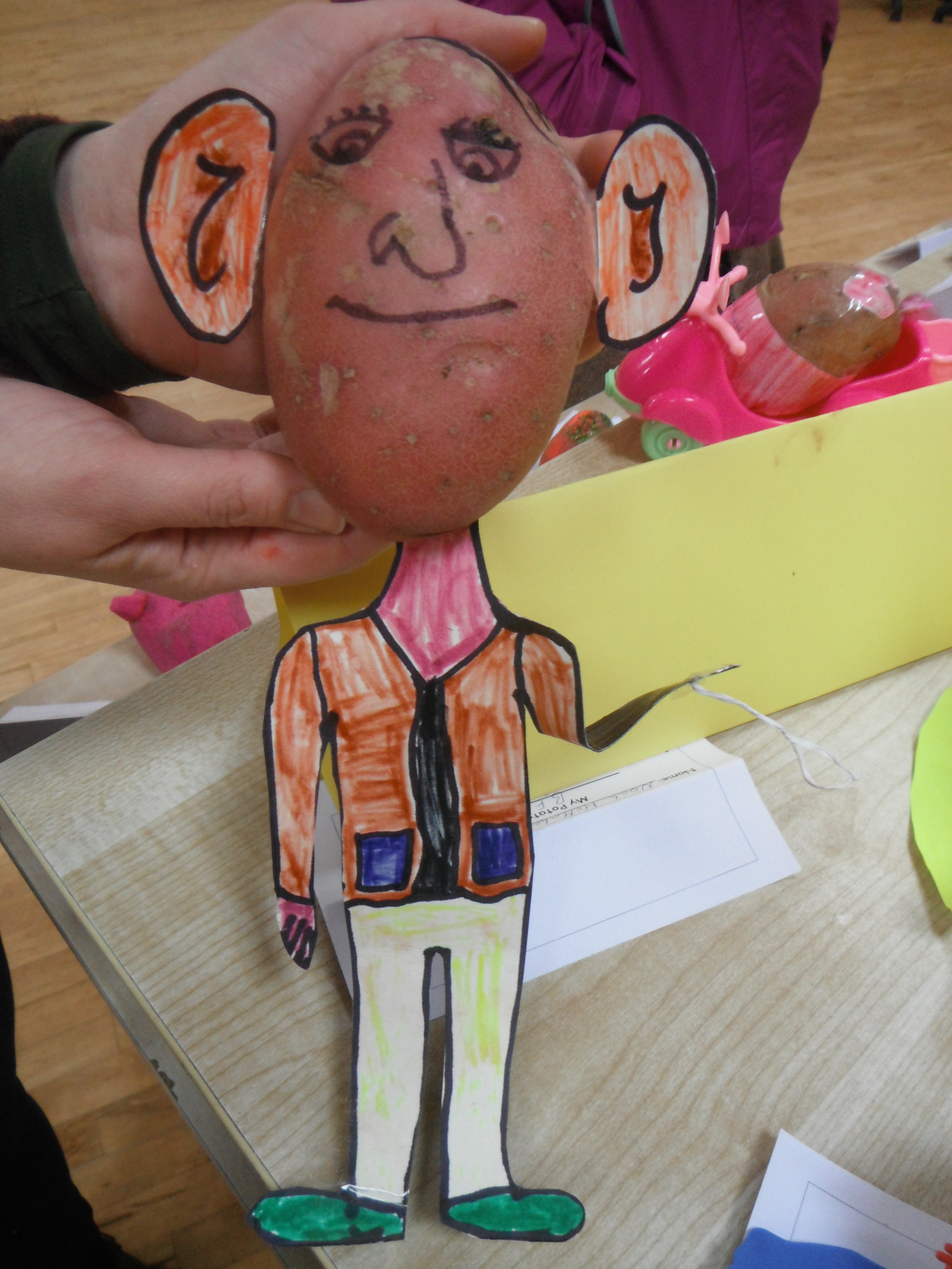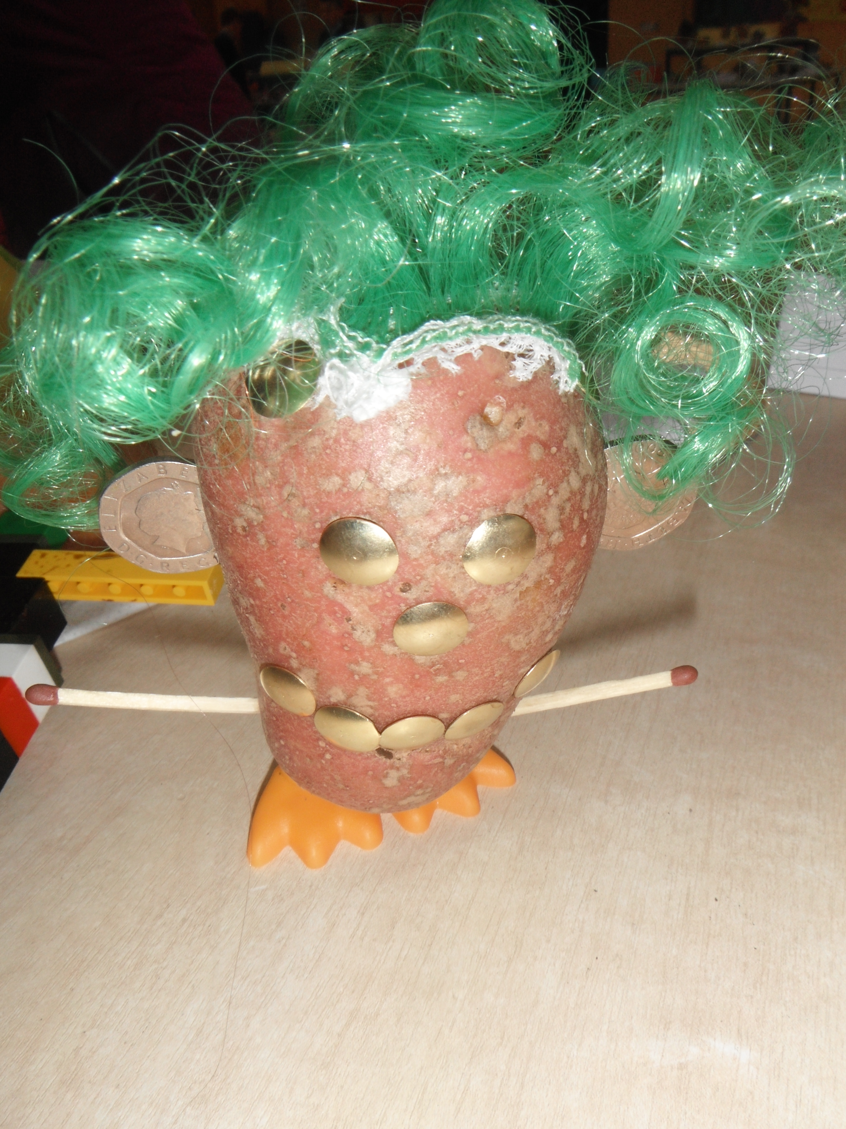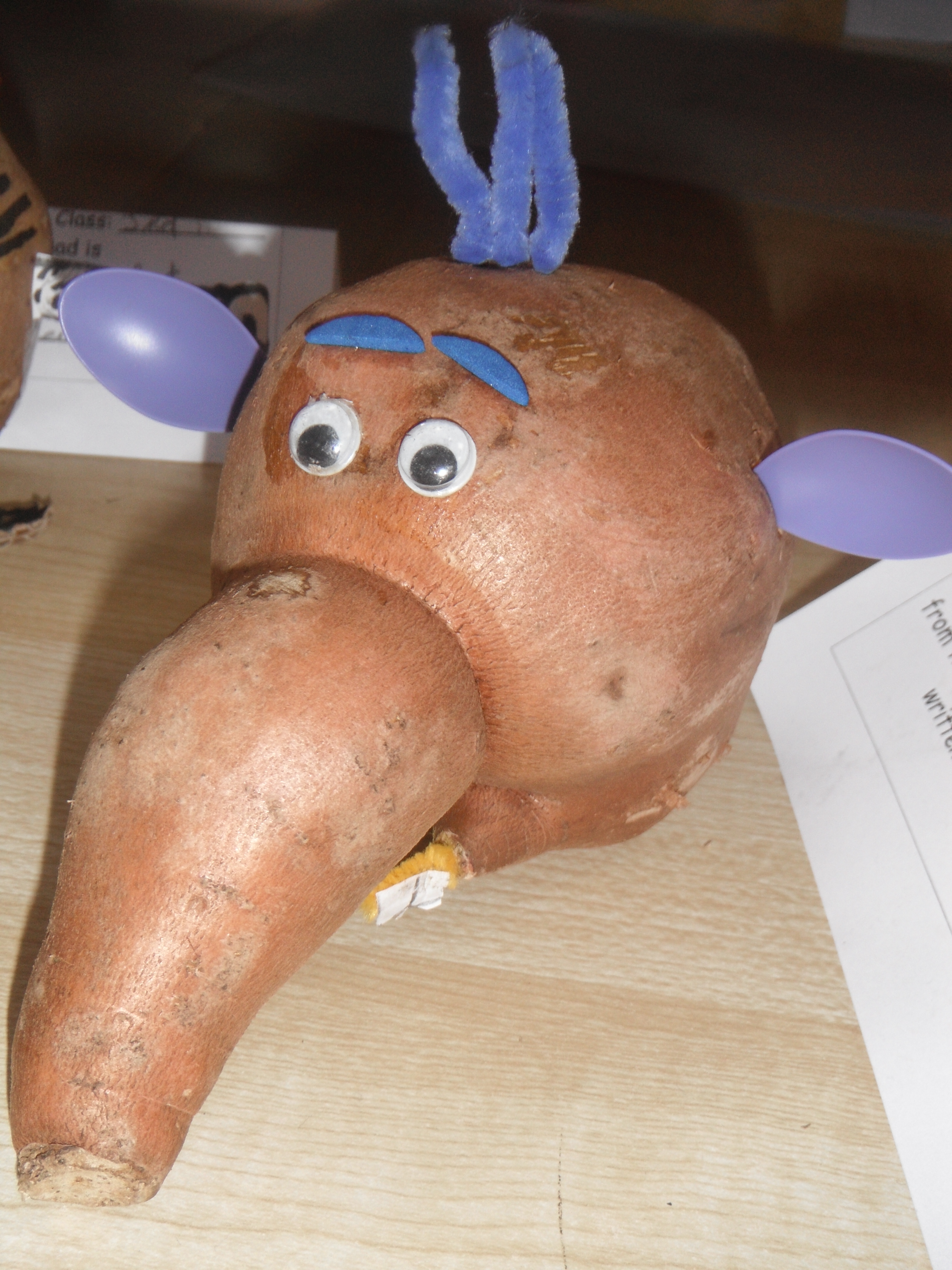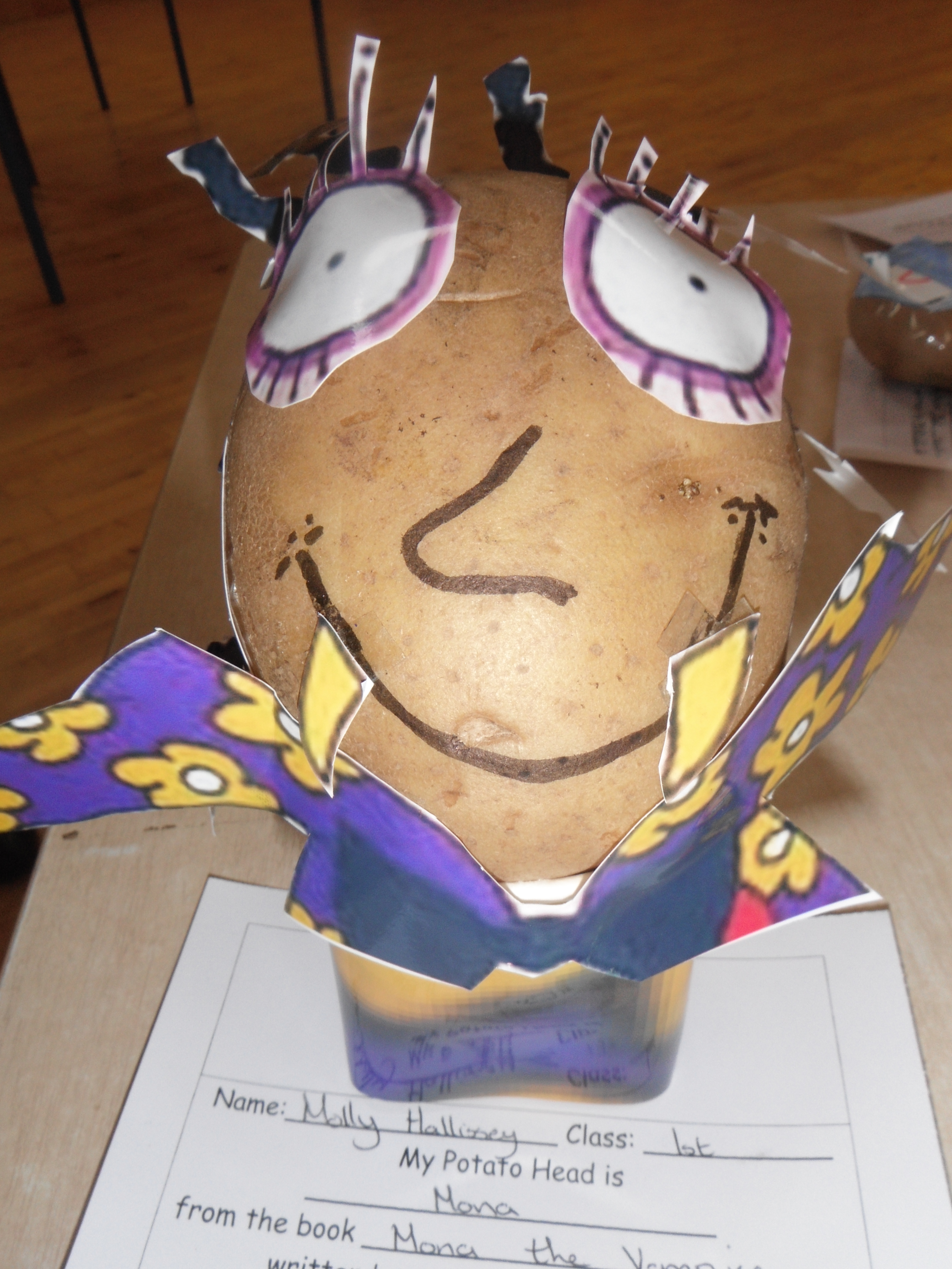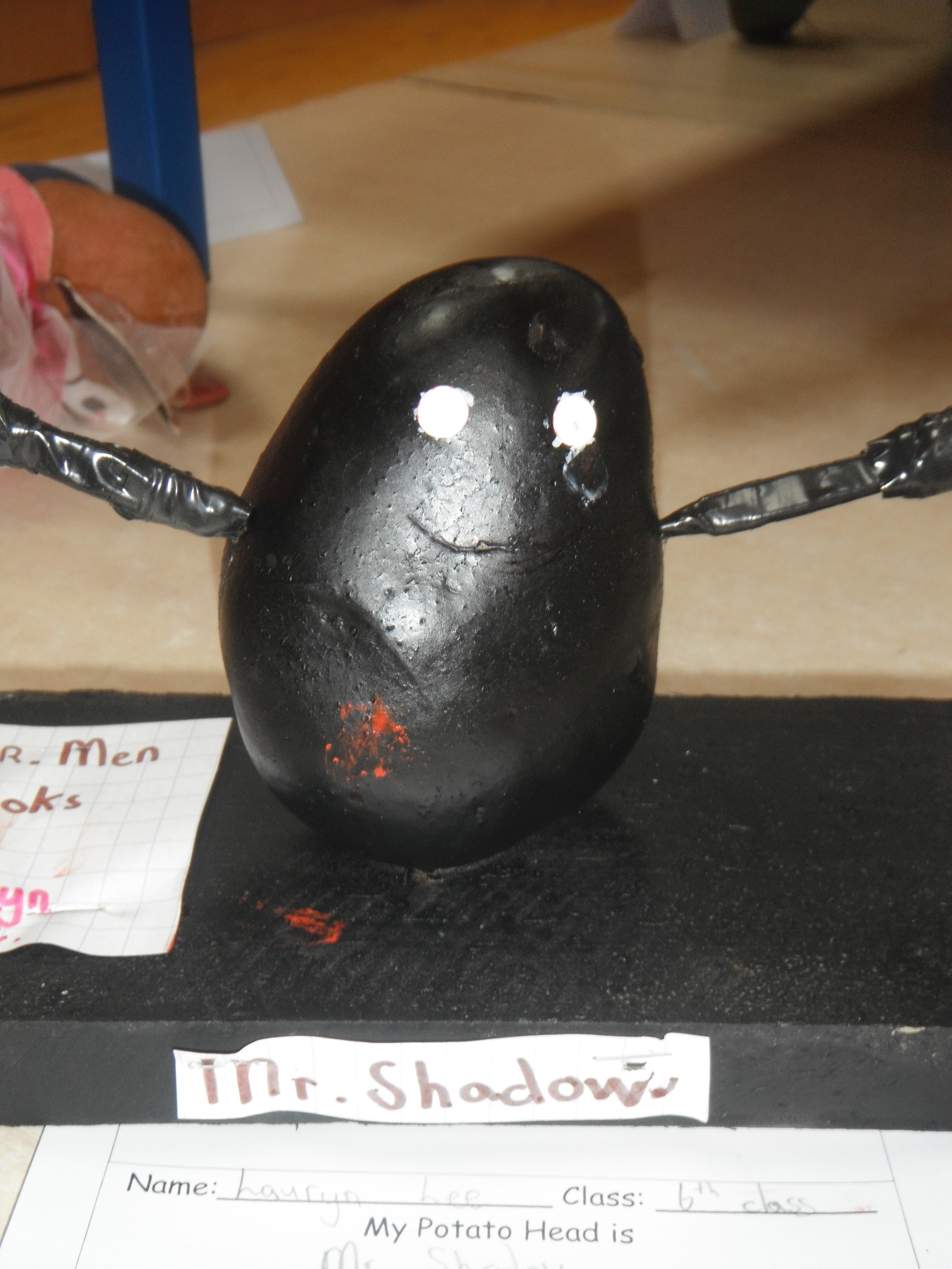 These are photographs of the fantastic potato head characters that children made this weekend and brought to school on Monday. All of the potato heads were made to resemble characters from a book. We had characters from fairytales, autobiographies, comic books and children’s novels. The display in the hall on Monday afternoon was wonderful. Every single potato head designer deserves a huge ‘WELL DONE!’ because these potatoes are absolutely amazing! Have a look…