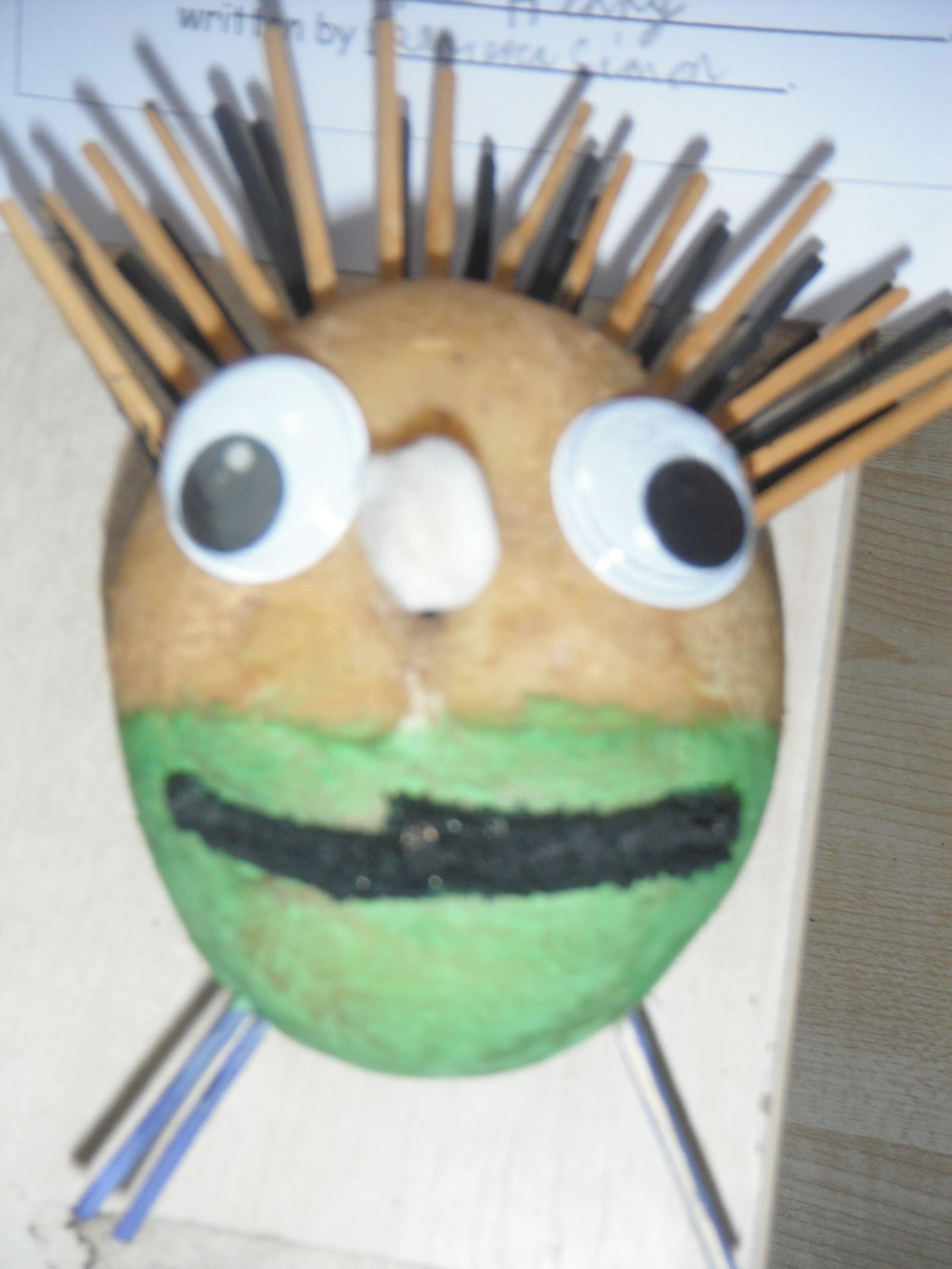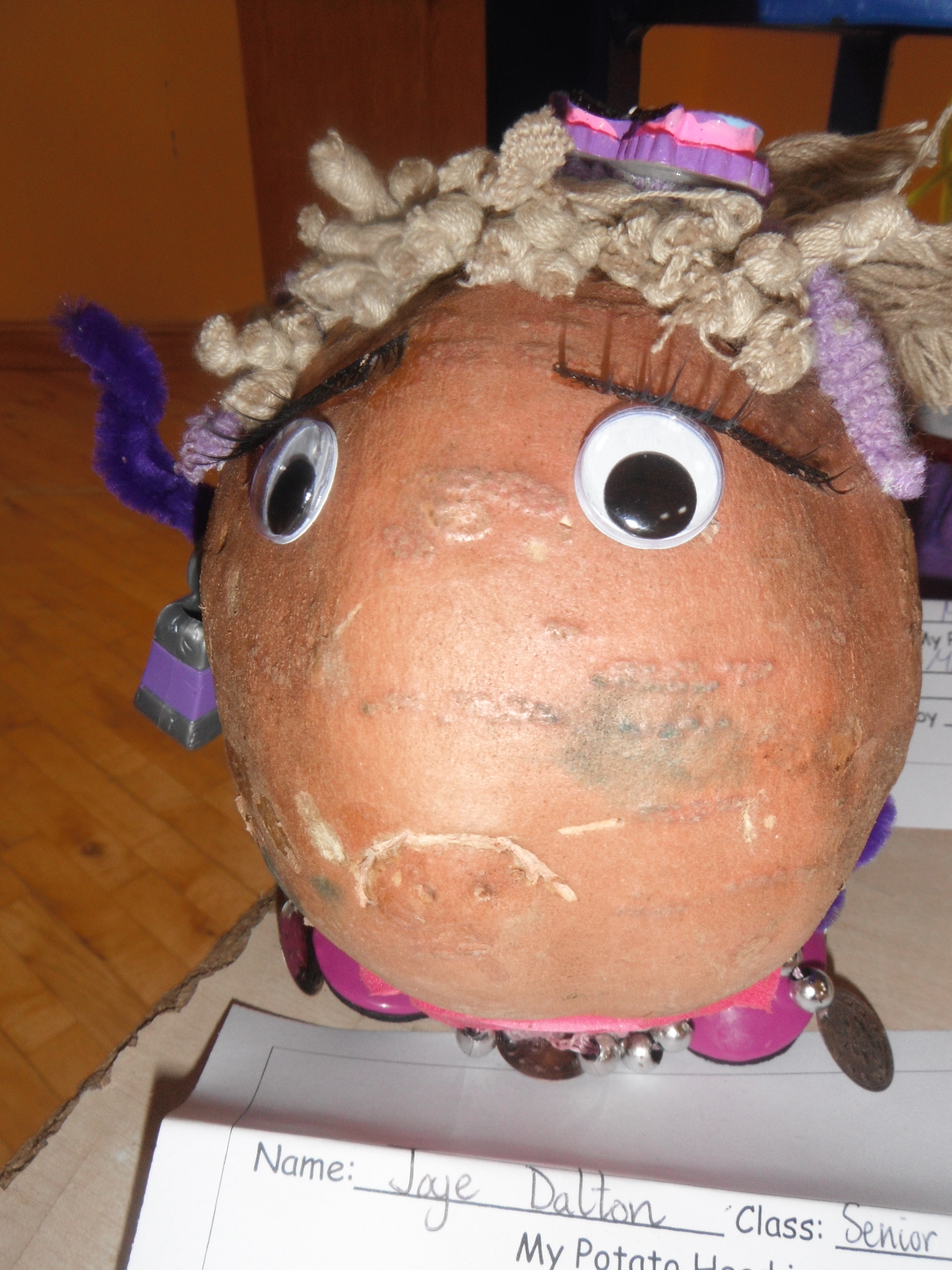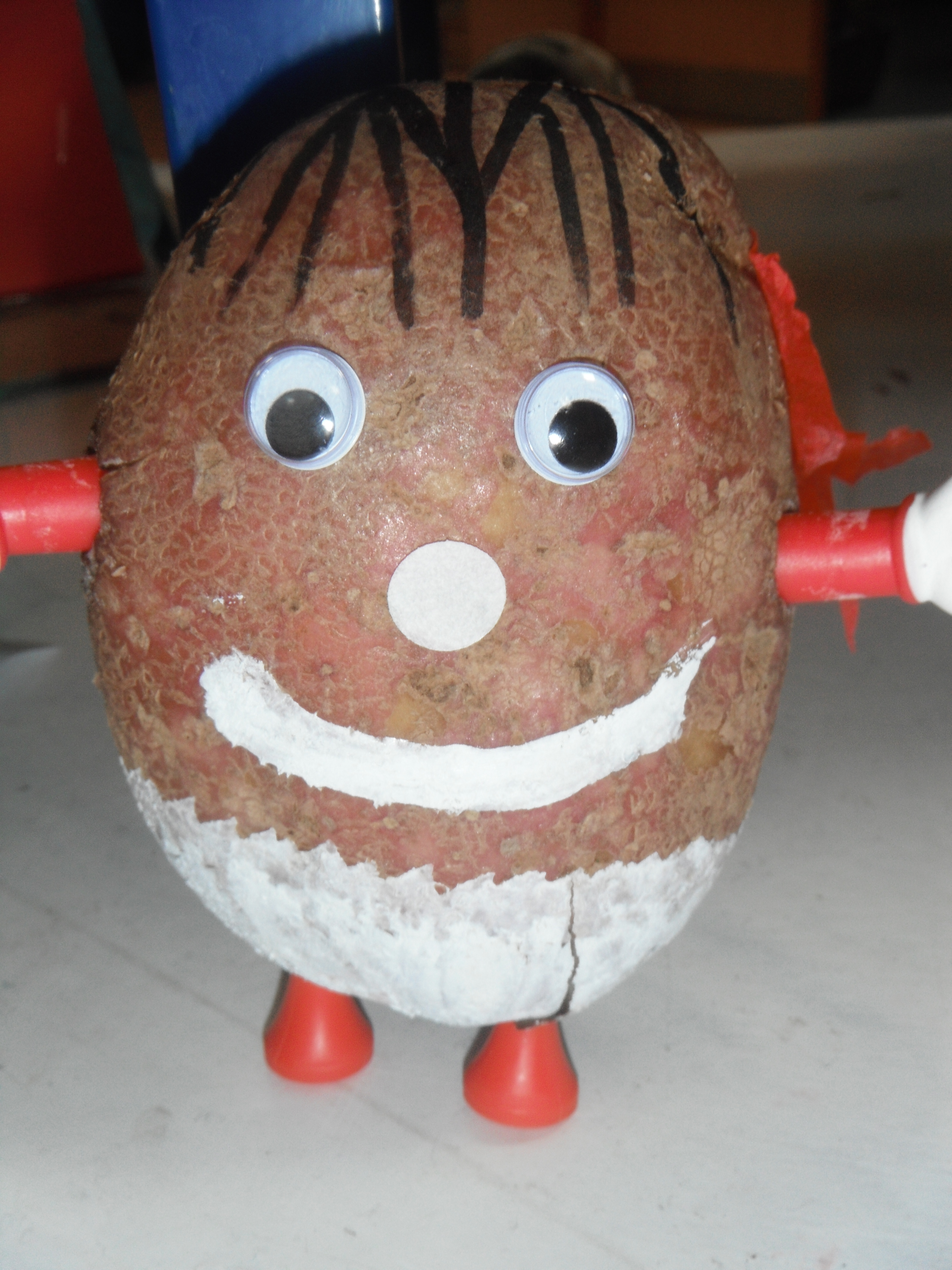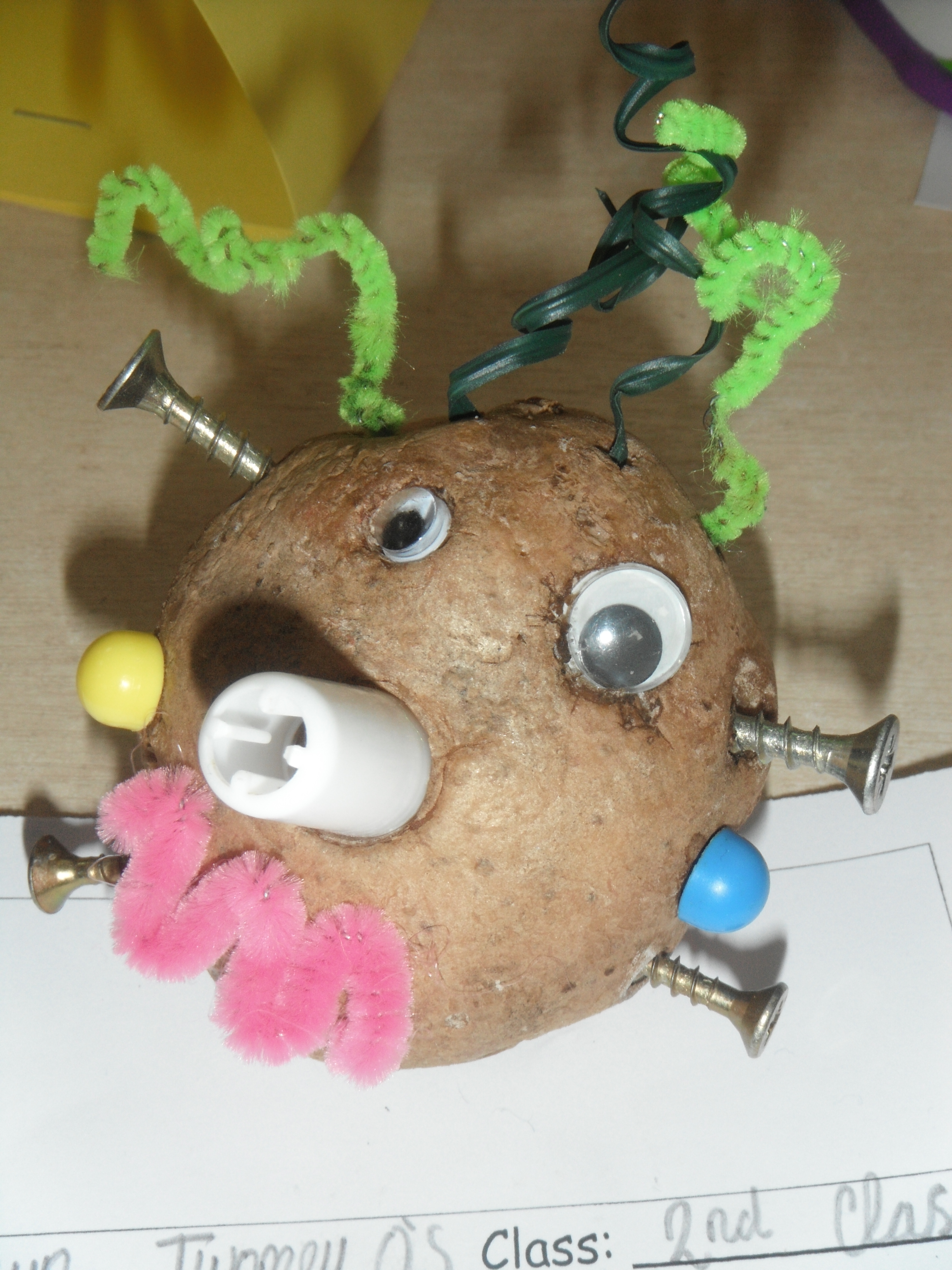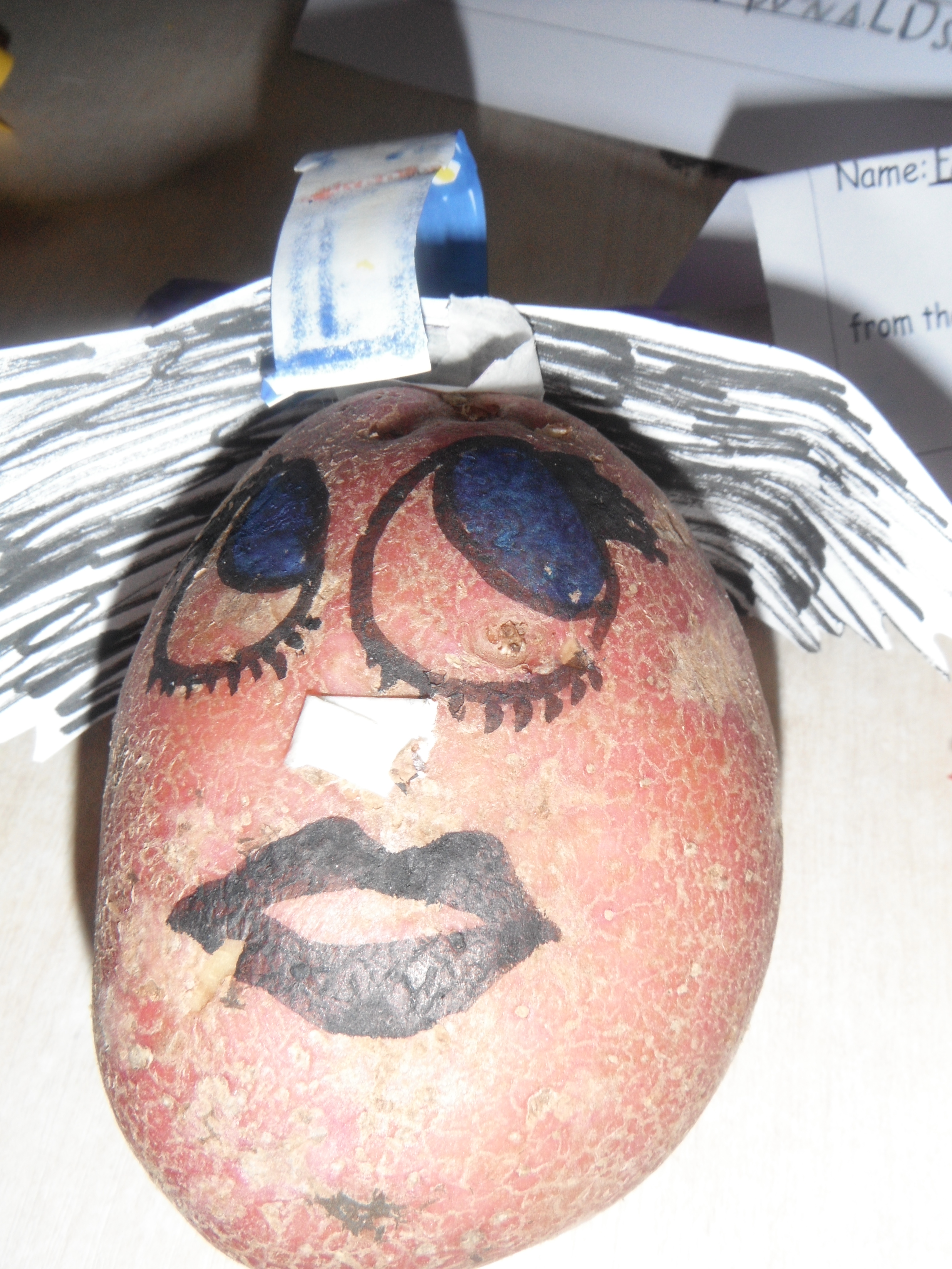 These are photographs of the fantastic potato head characters that children made this weekend and brought to school on Monday. All of the potato heads were made to resemble characters from a book. We had characters from fairytales, autobiographies, comic books and children’s novels. The display in the hall on Monday afternoon was wonderful. Every single potato head designer deserves a huge ‘WELL DONE!’ because these potatoes are absolutely amazing! Have a look…