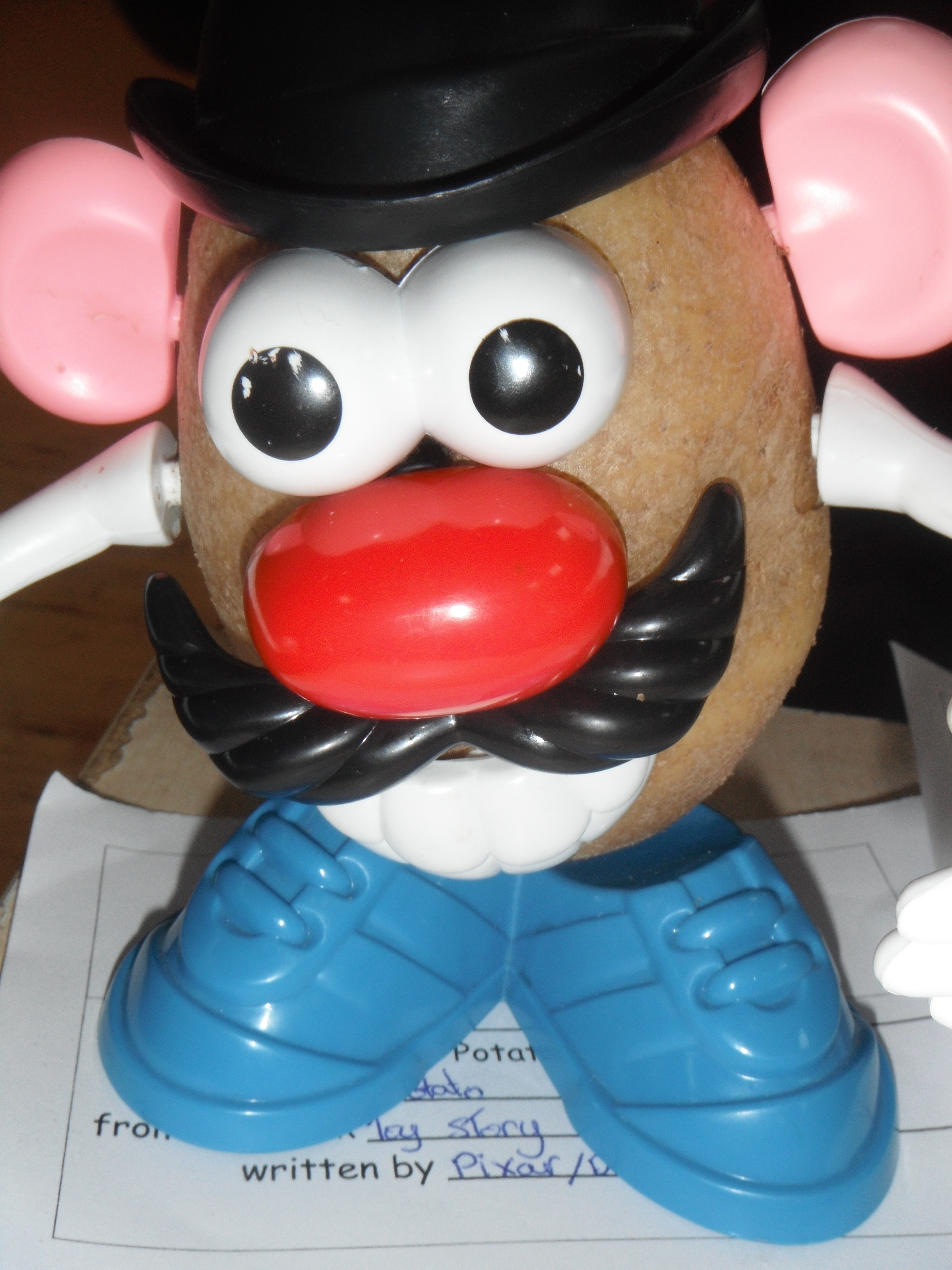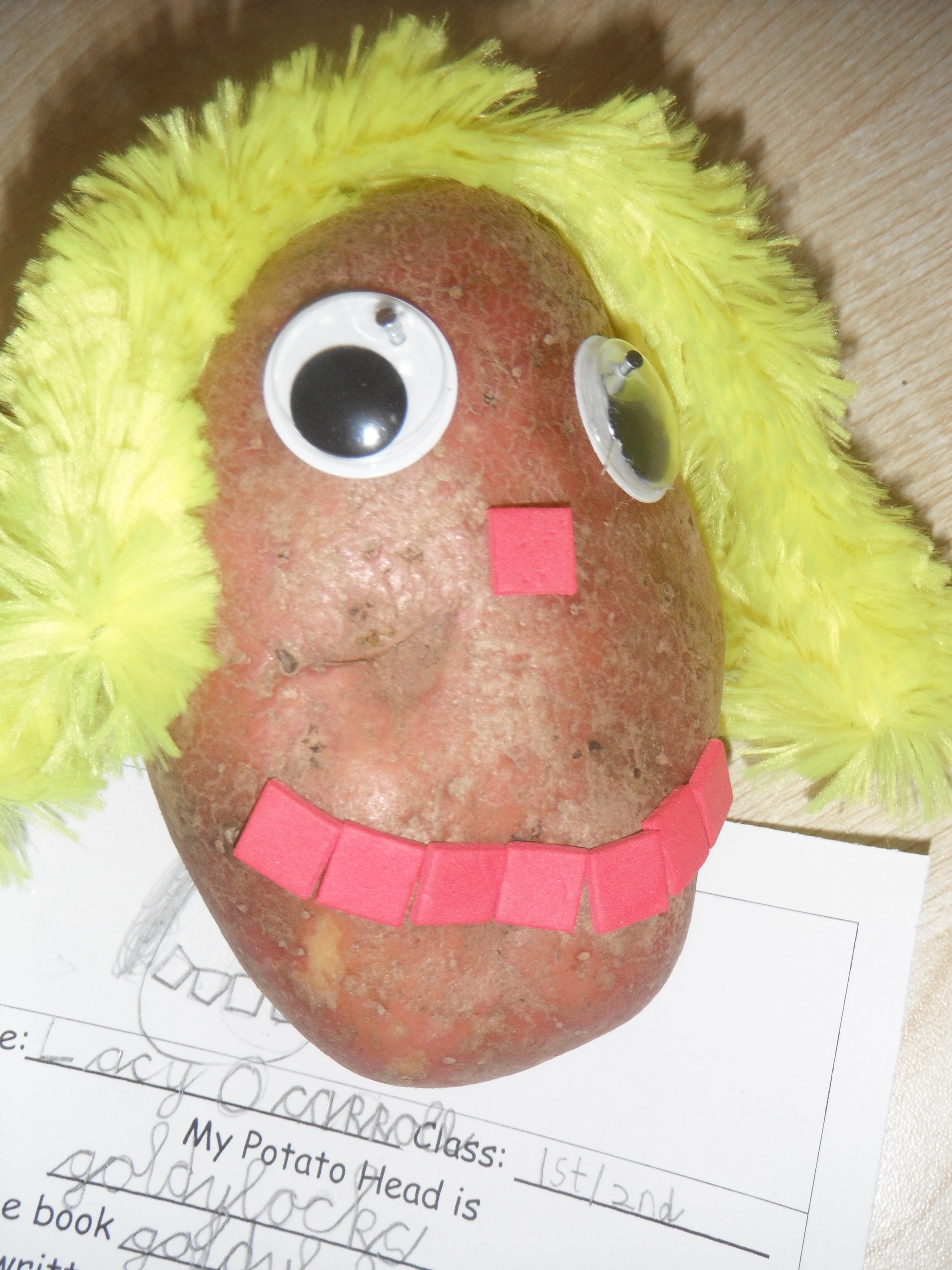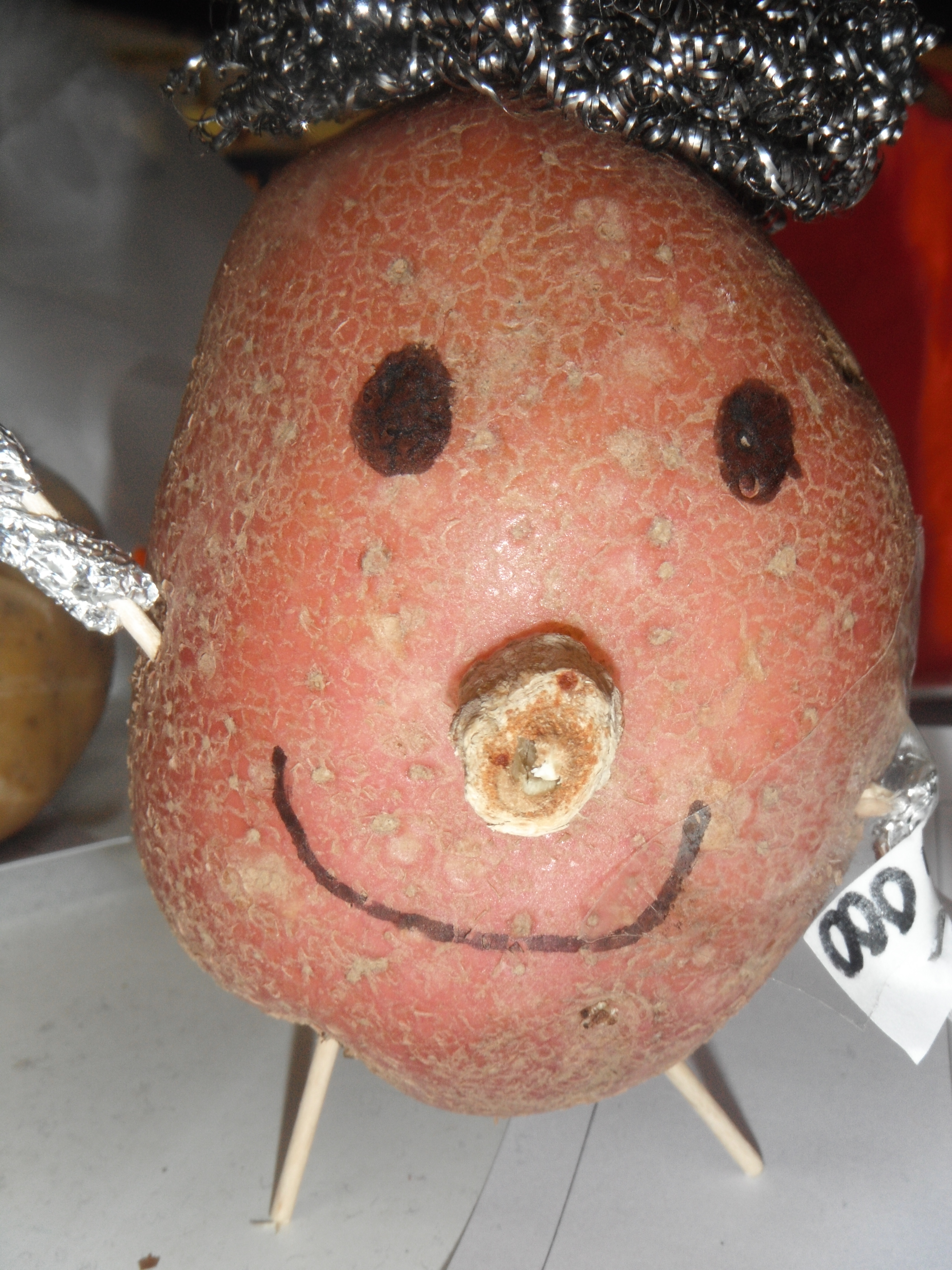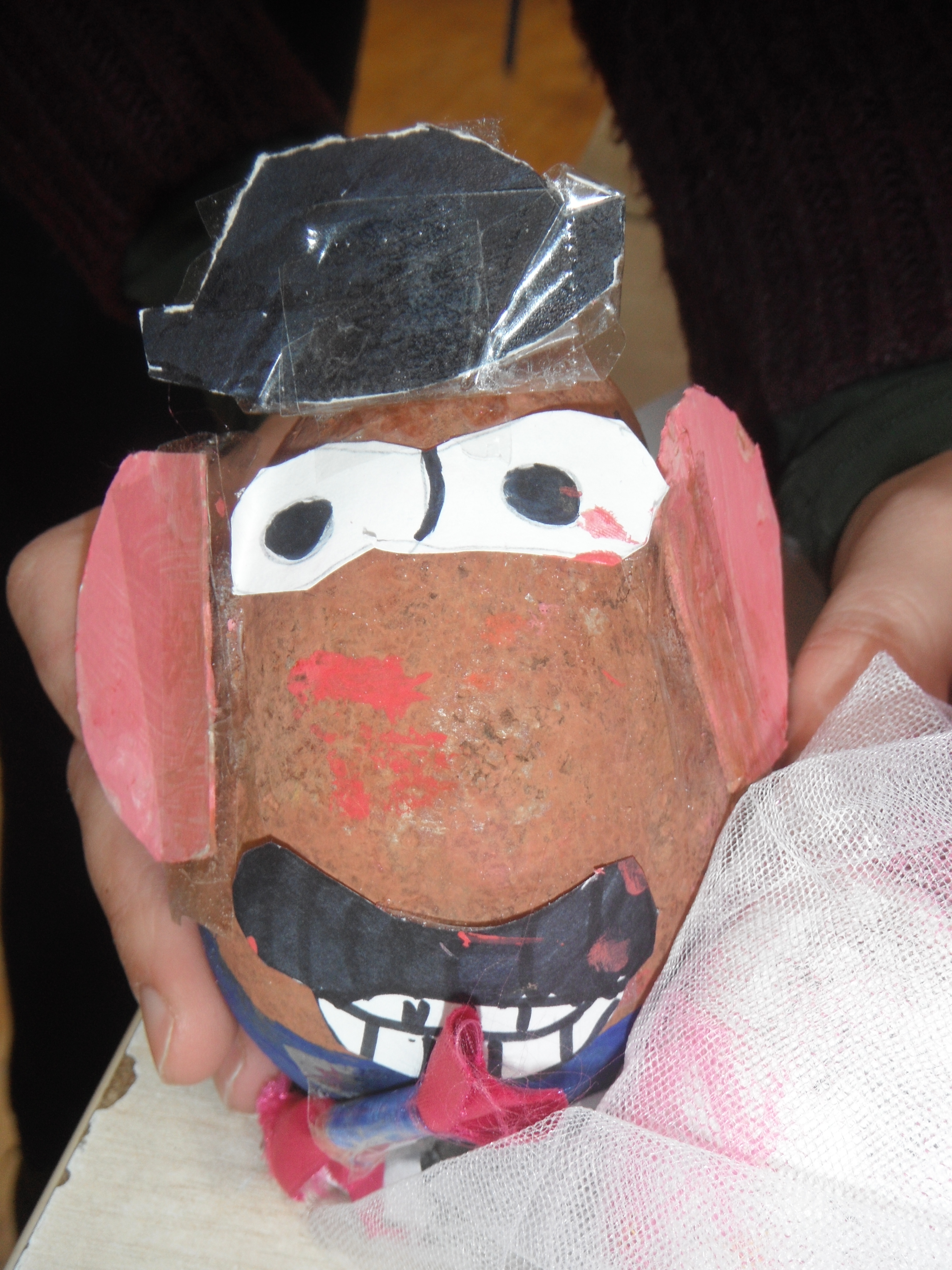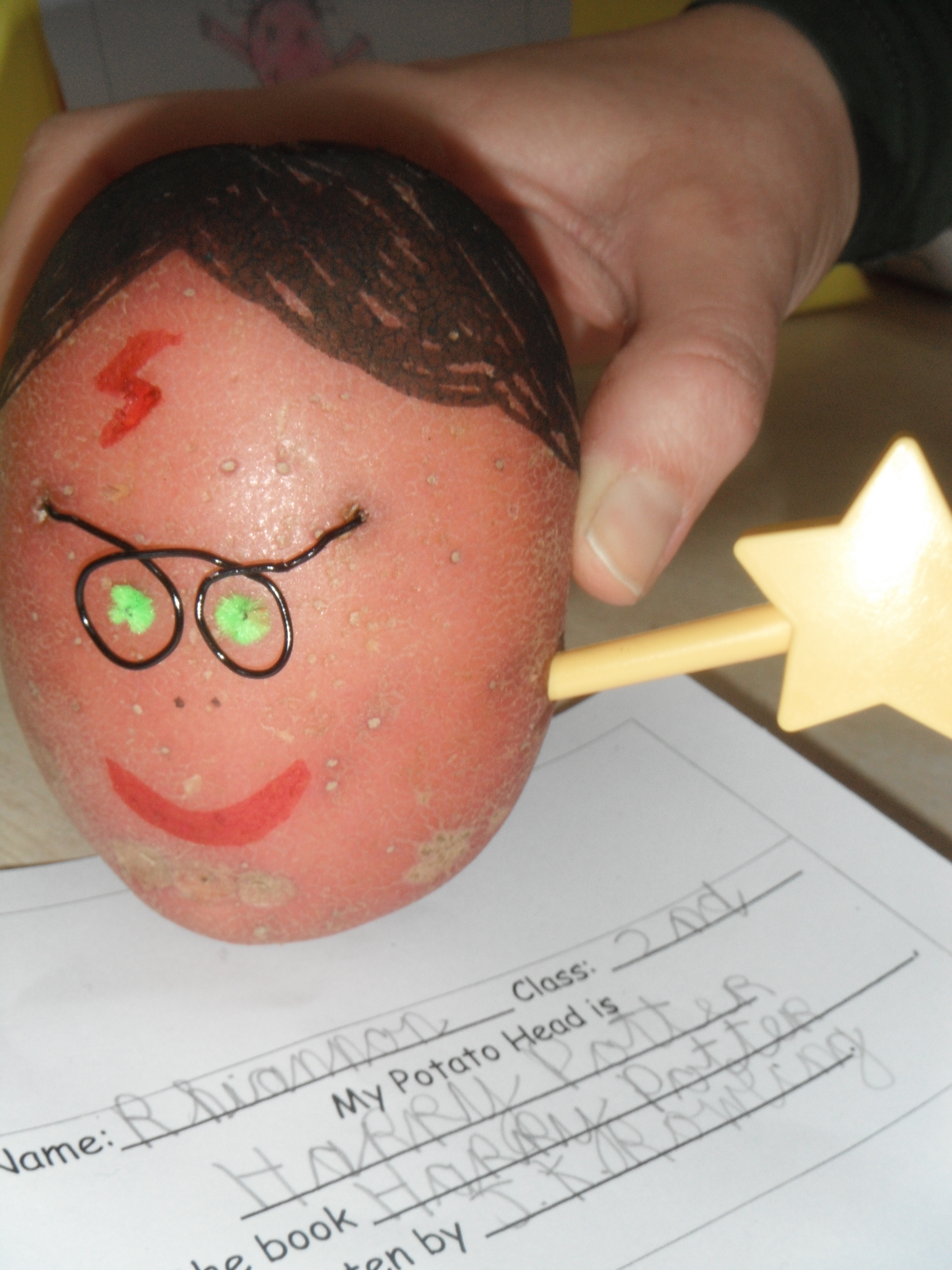 These are photographs of the fantastic potato head characters that children made this weekend and brought to school on Monday. All of the potato heads were made to resemble characters from a book. We had characters from fairytales, autobiographies, comic books and children’s novels. The display in the hall on Monday afternoon was wonderful. Every single potato head designer deserves a huge ‘WELL DONE!’ because these potatoes are absolutely amazing! Have a look…