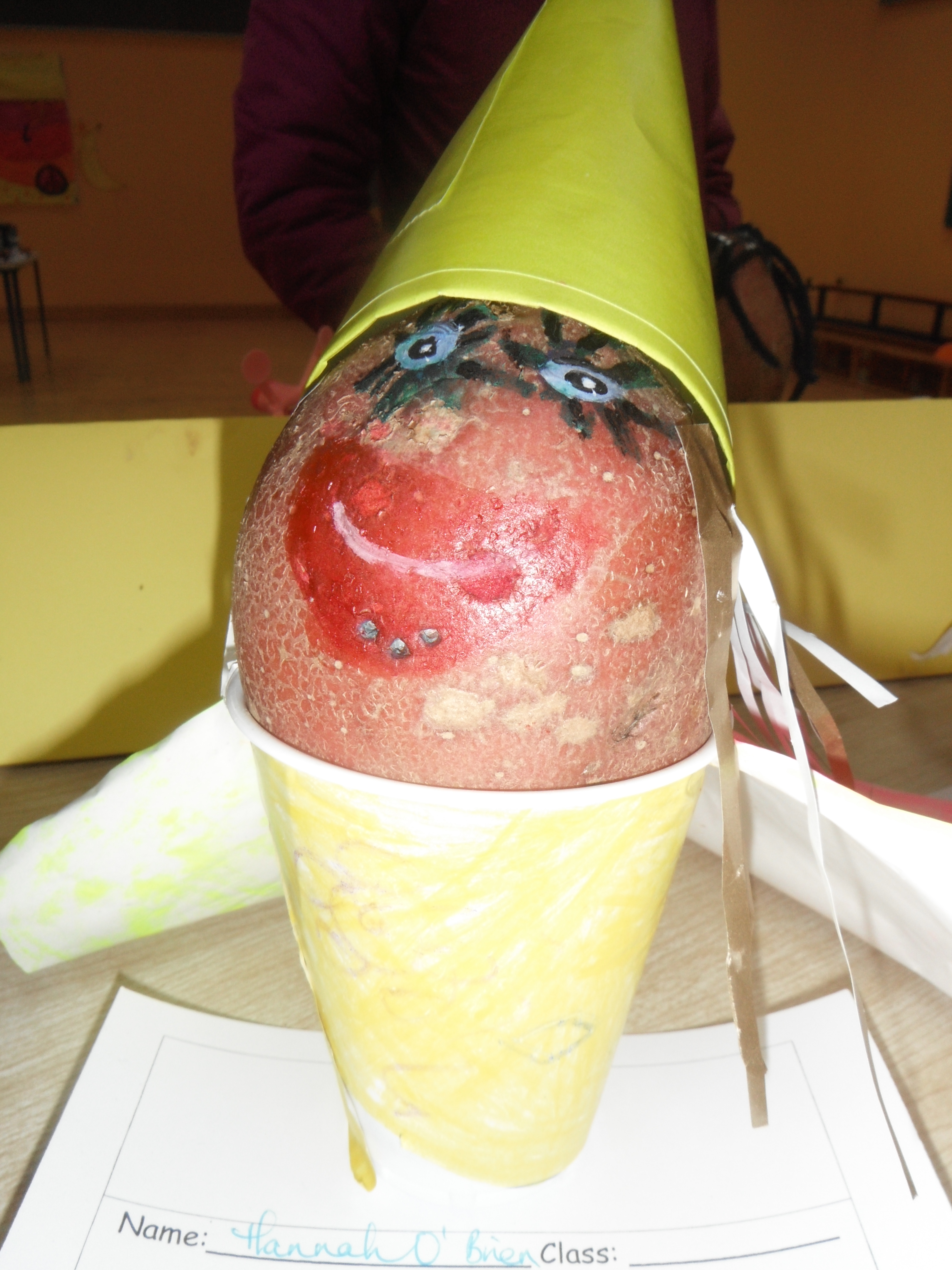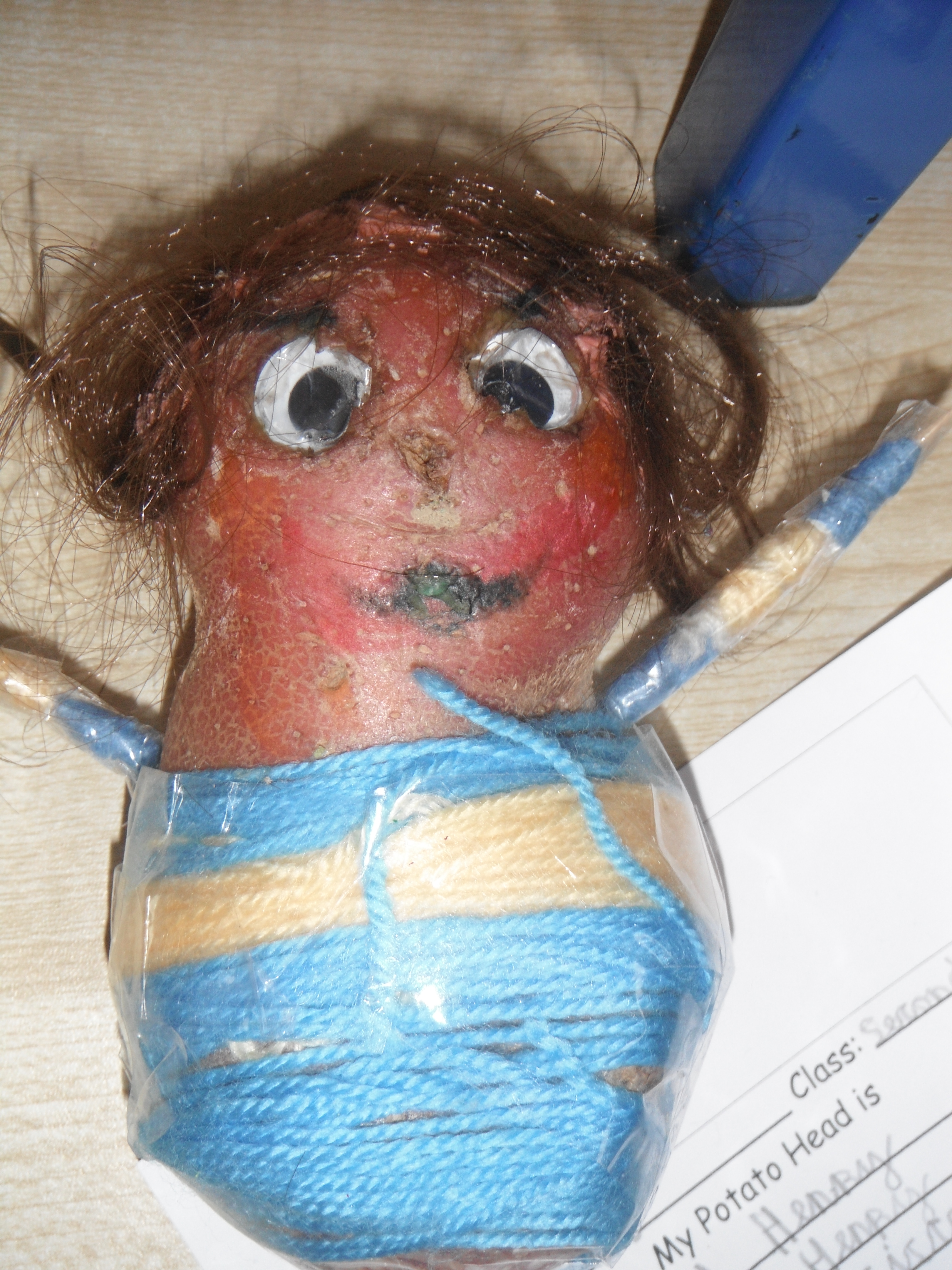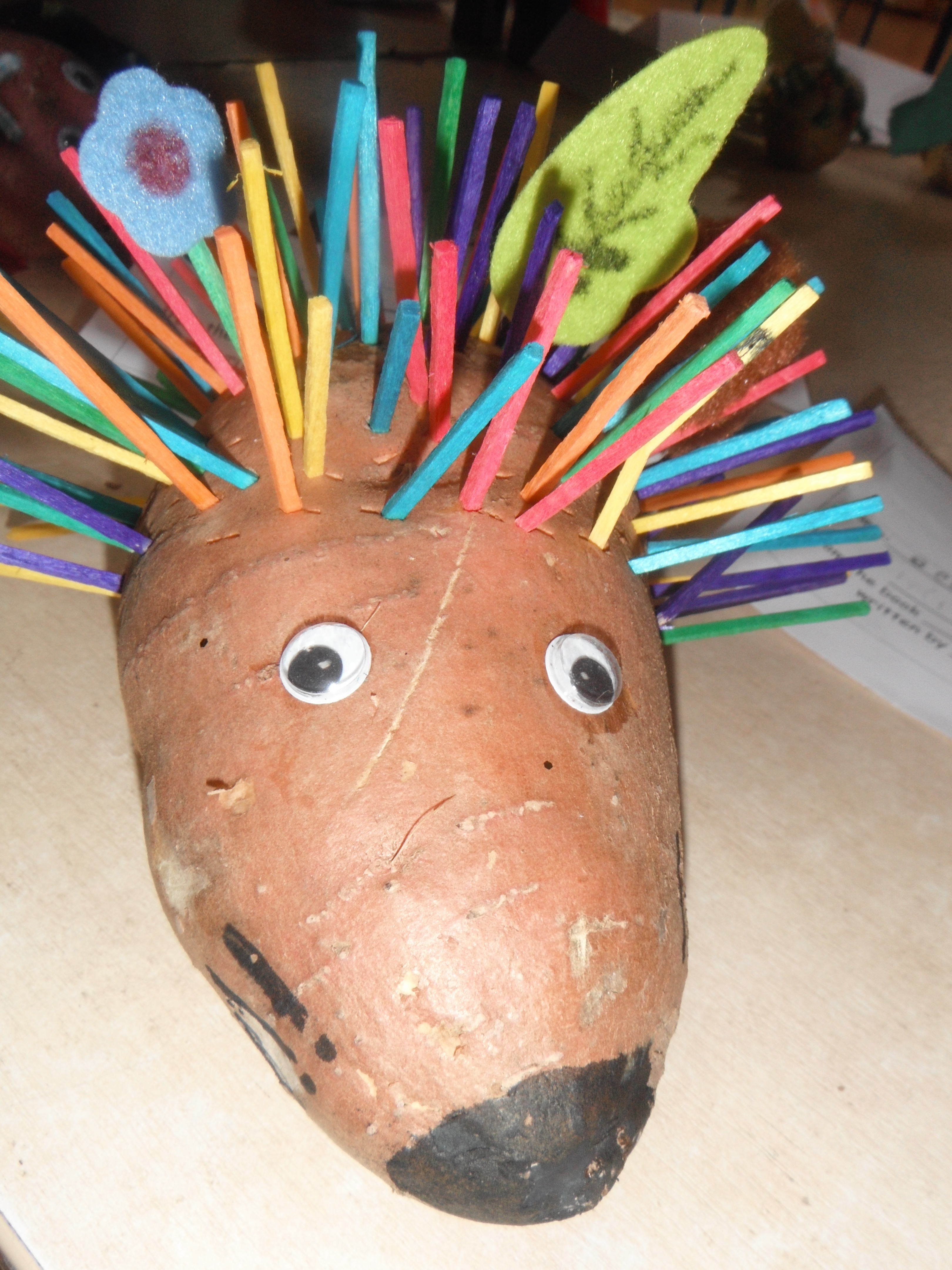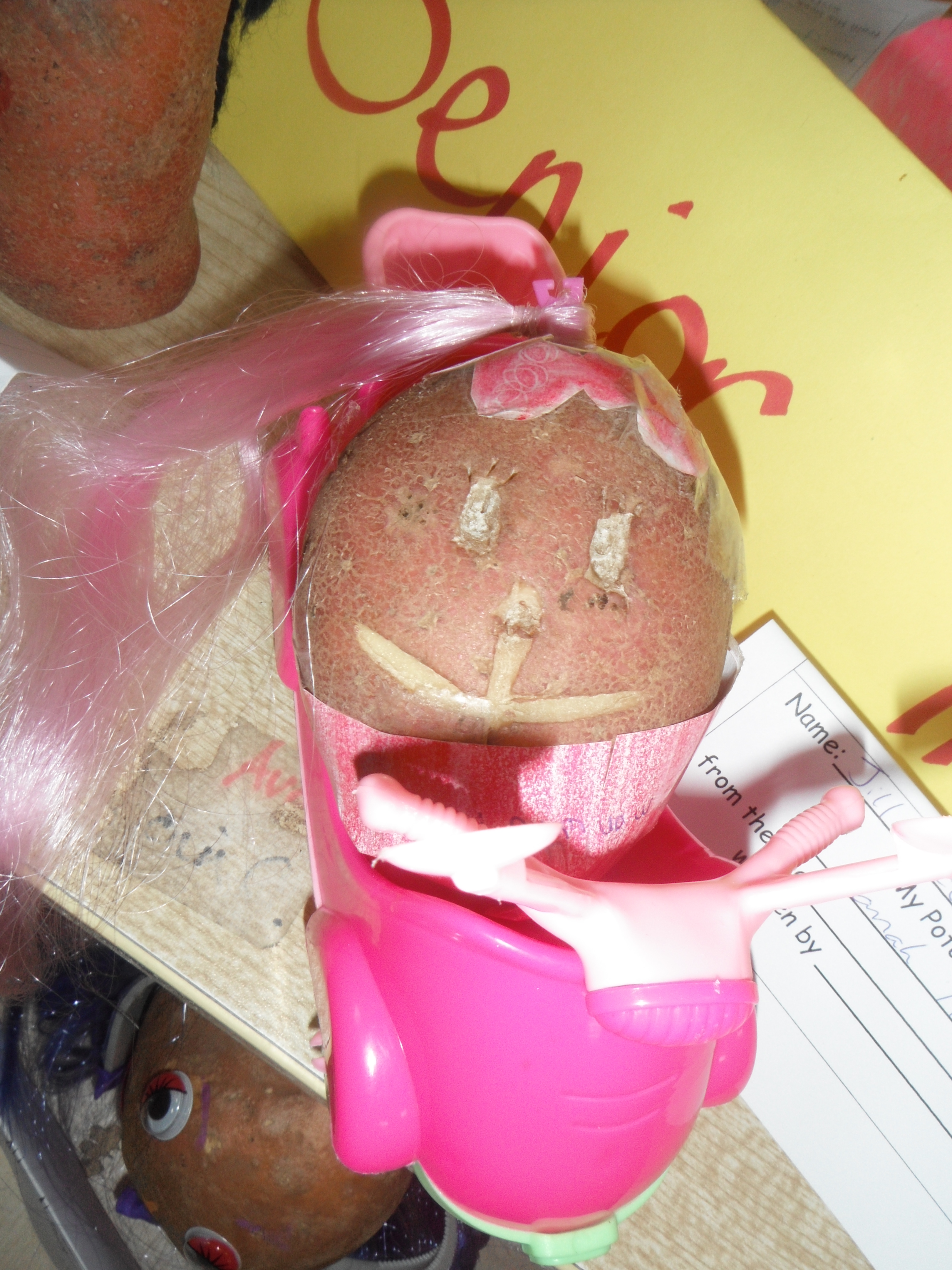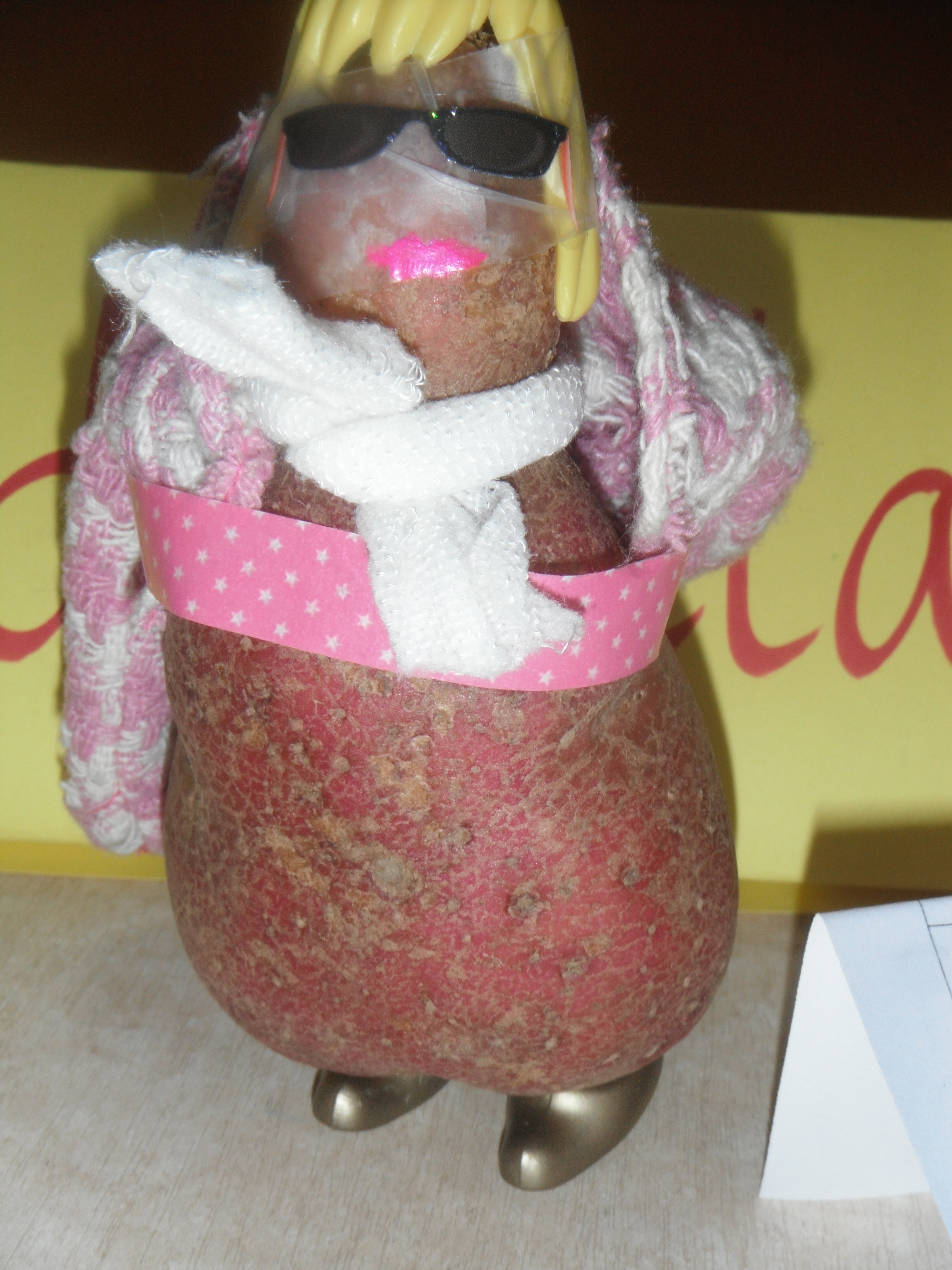 These are photographs of the fantastic potato head characters that children made this weekend and brought to school on Monday. All of the potato heads were made to resemble characters from a book. We had characters from fairytales, autobiographies, comic books and children’s novels. The display in the hall on Monday afternoon was wonderful. Every single potato head designer deserves a huge ‘WELL DONE!’ because these potatoes are absolutely amazing! Have a look…