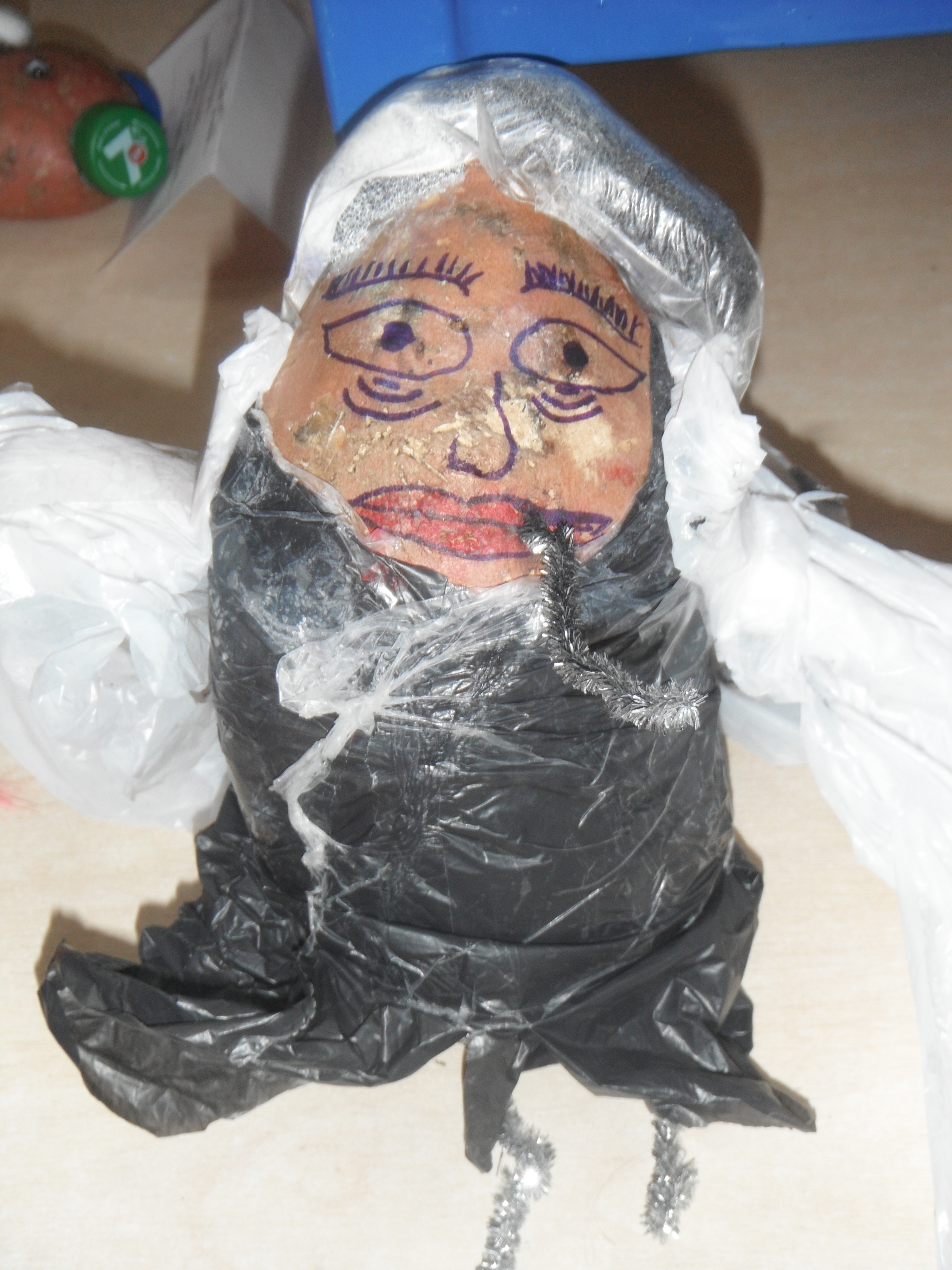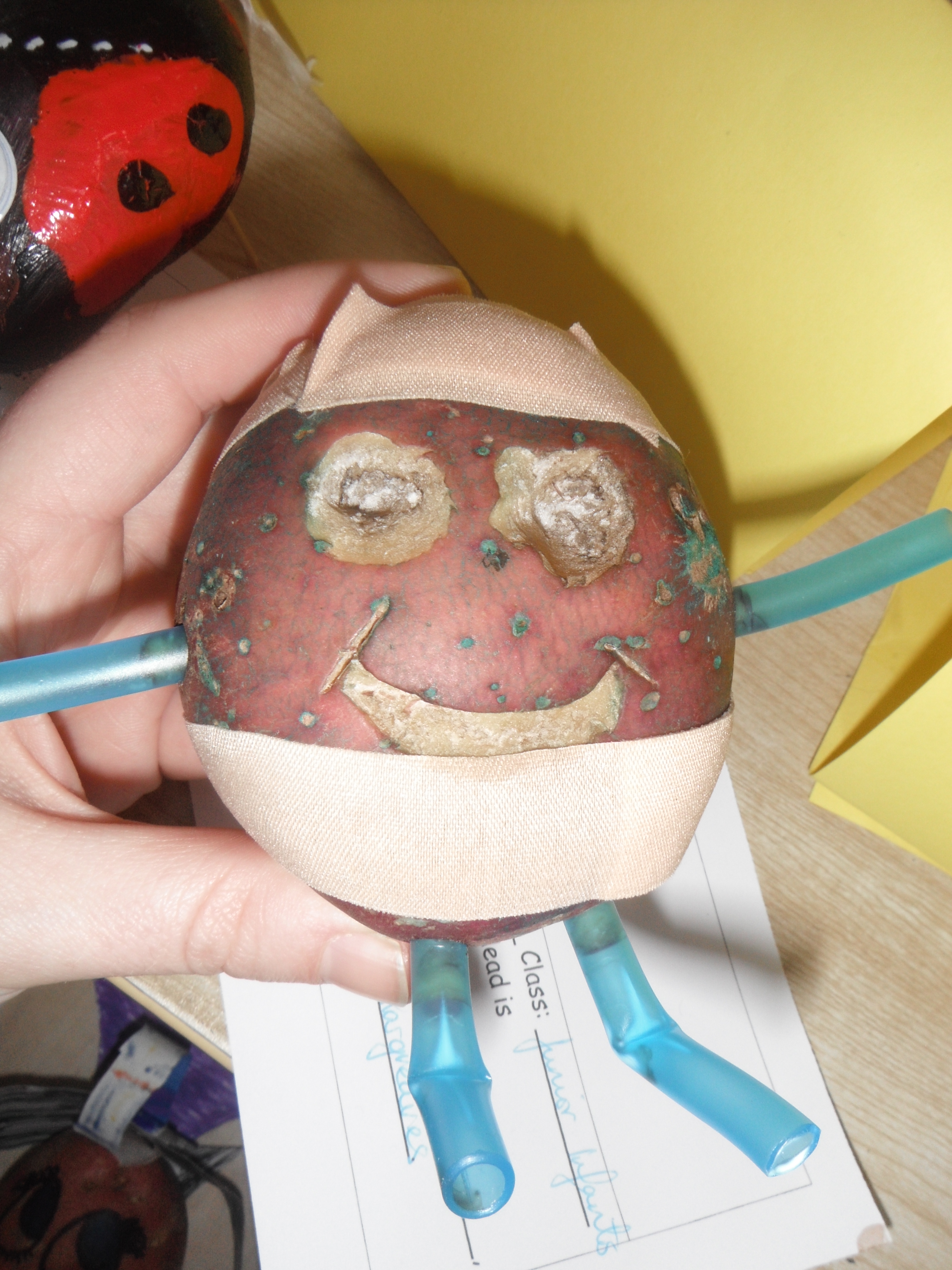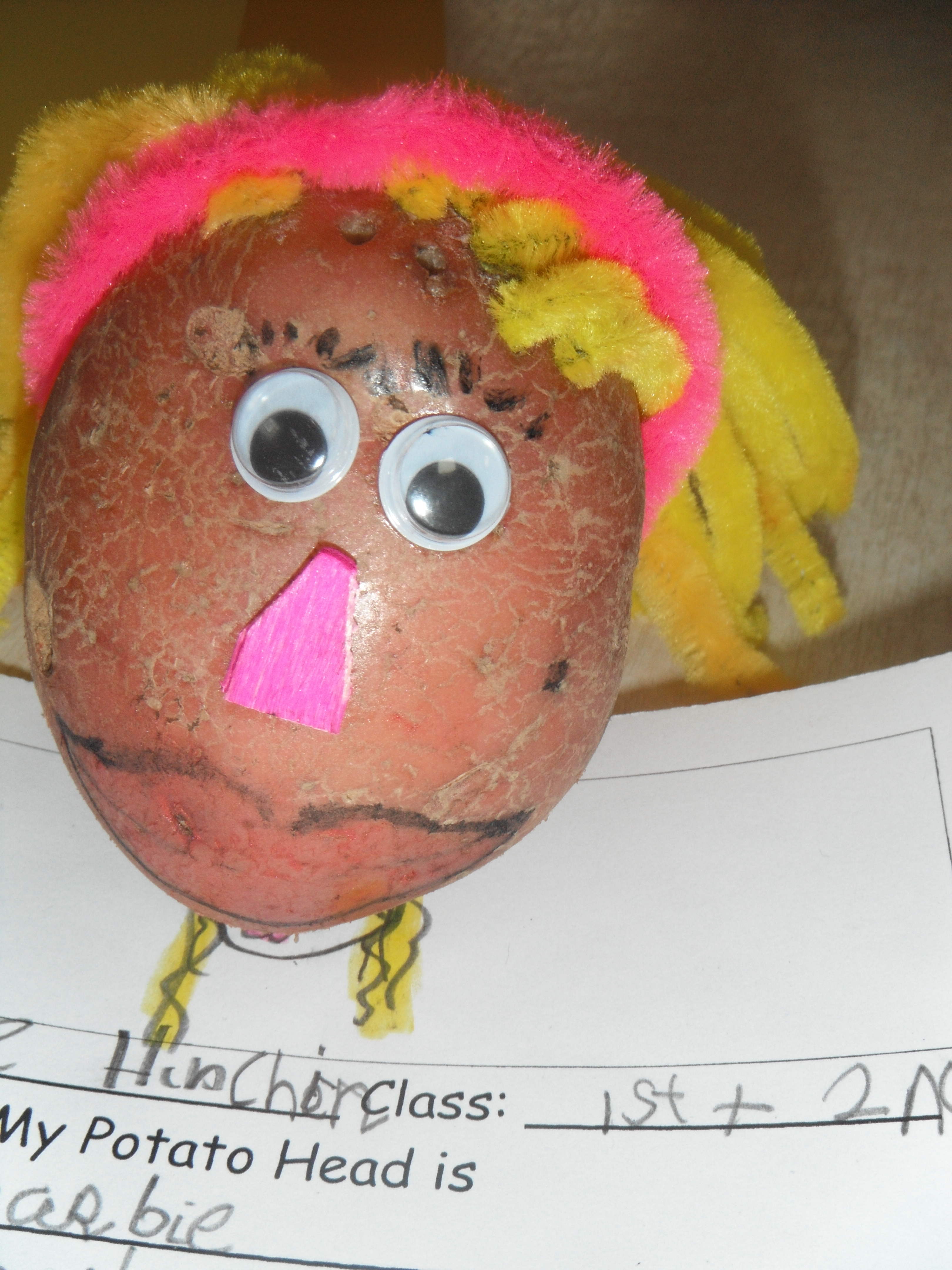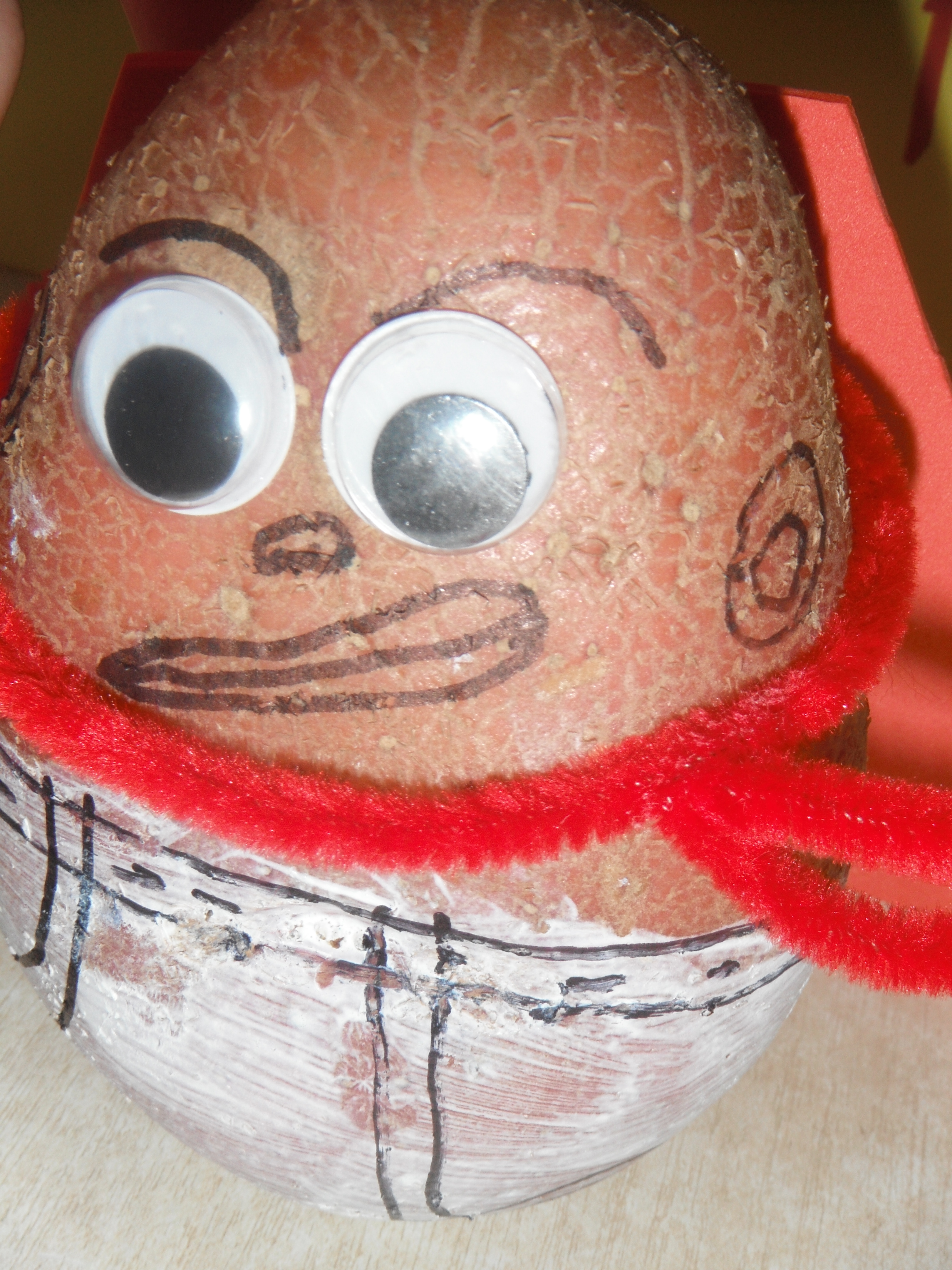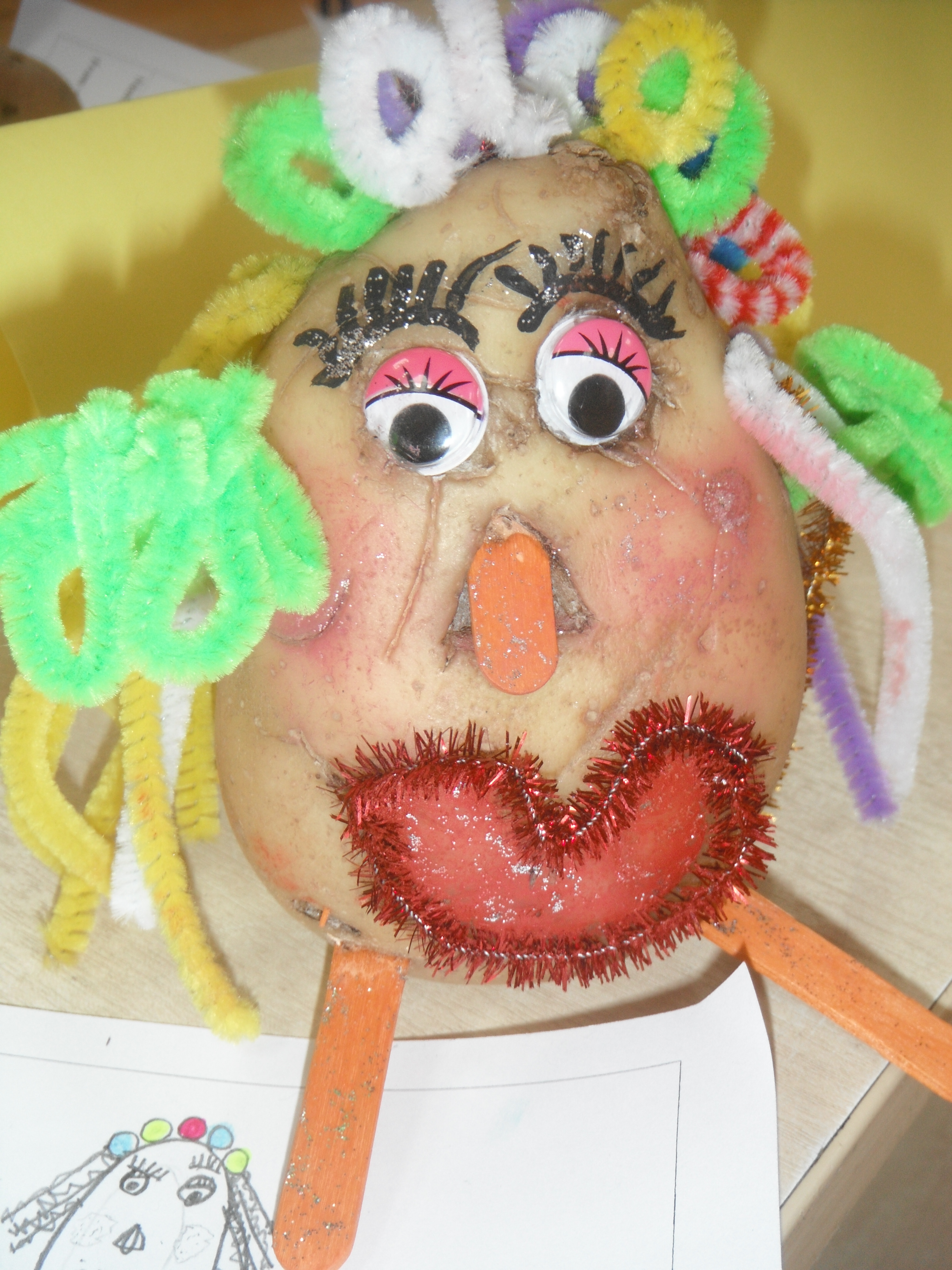 These are photographs of the fantastic potato head characters that children made this weekend and brought to school on Monday. All of the potato heads were made to resemble characters from a book. We had characters from fairytales, autobiographies, comic books and children’s novels. The display in the hall on Monday afternoon was wonderful. Every single potato head designer deserves a huge ‘WELL DONE!’ because these potatoes are absolutely amazing! Have a look…
