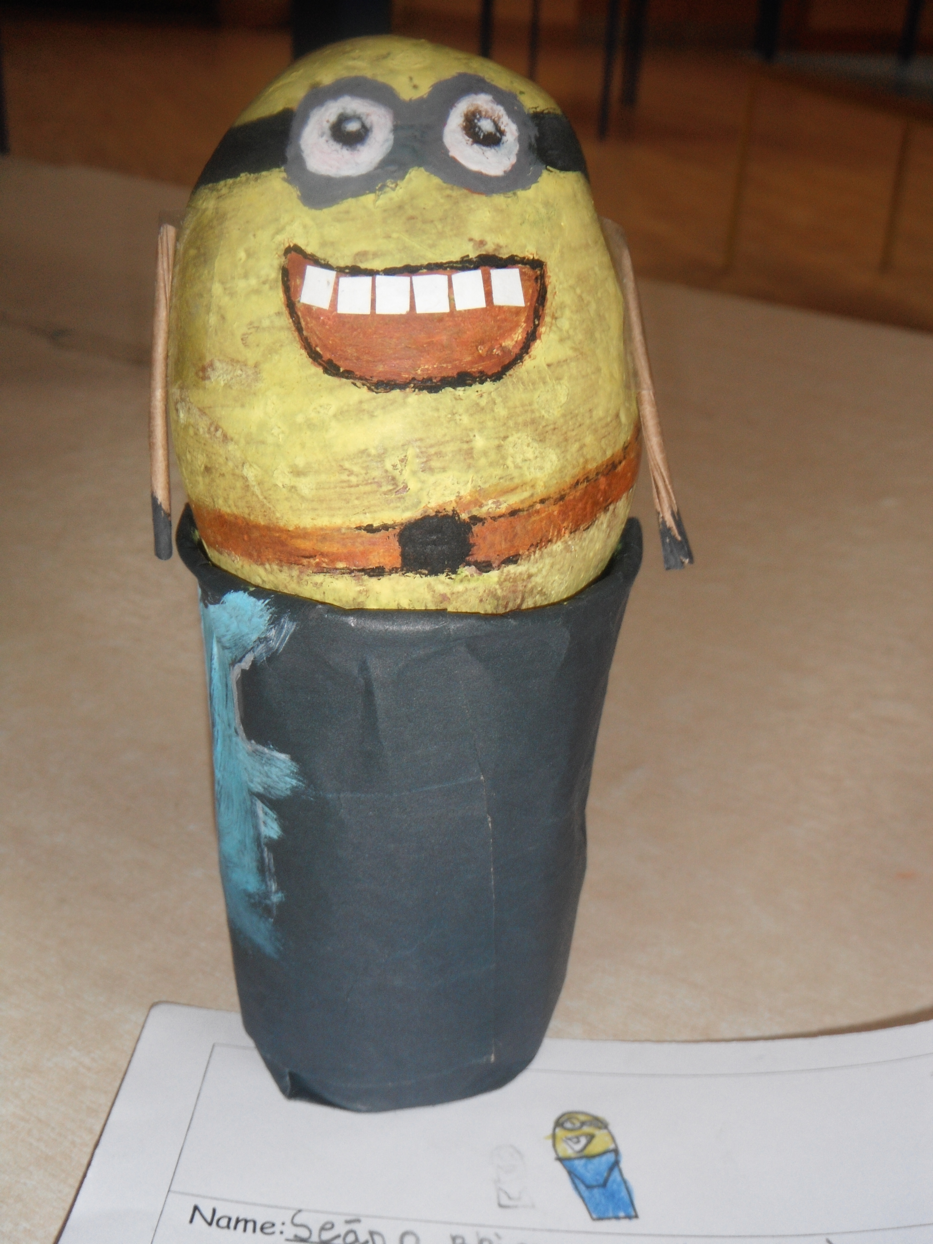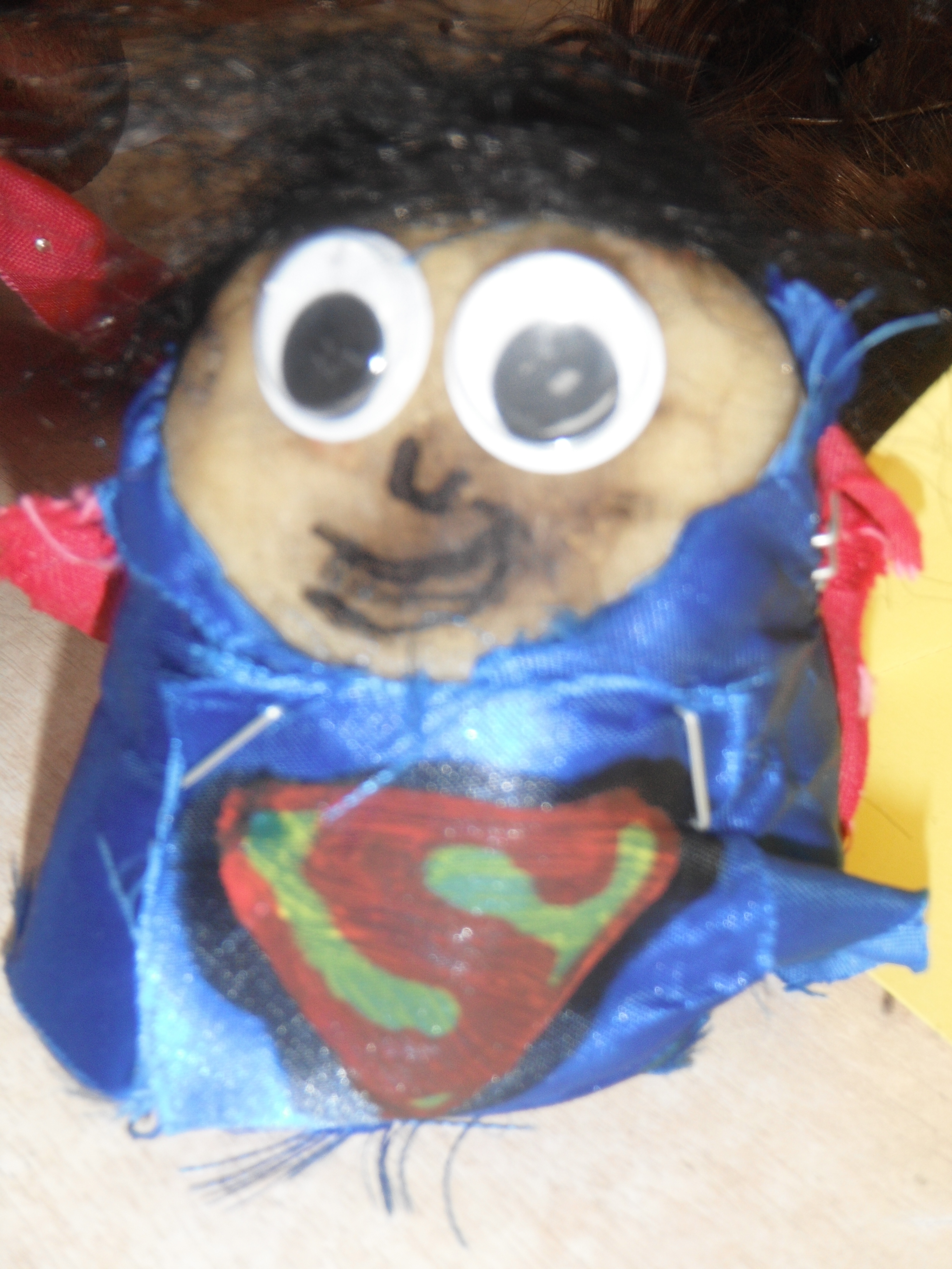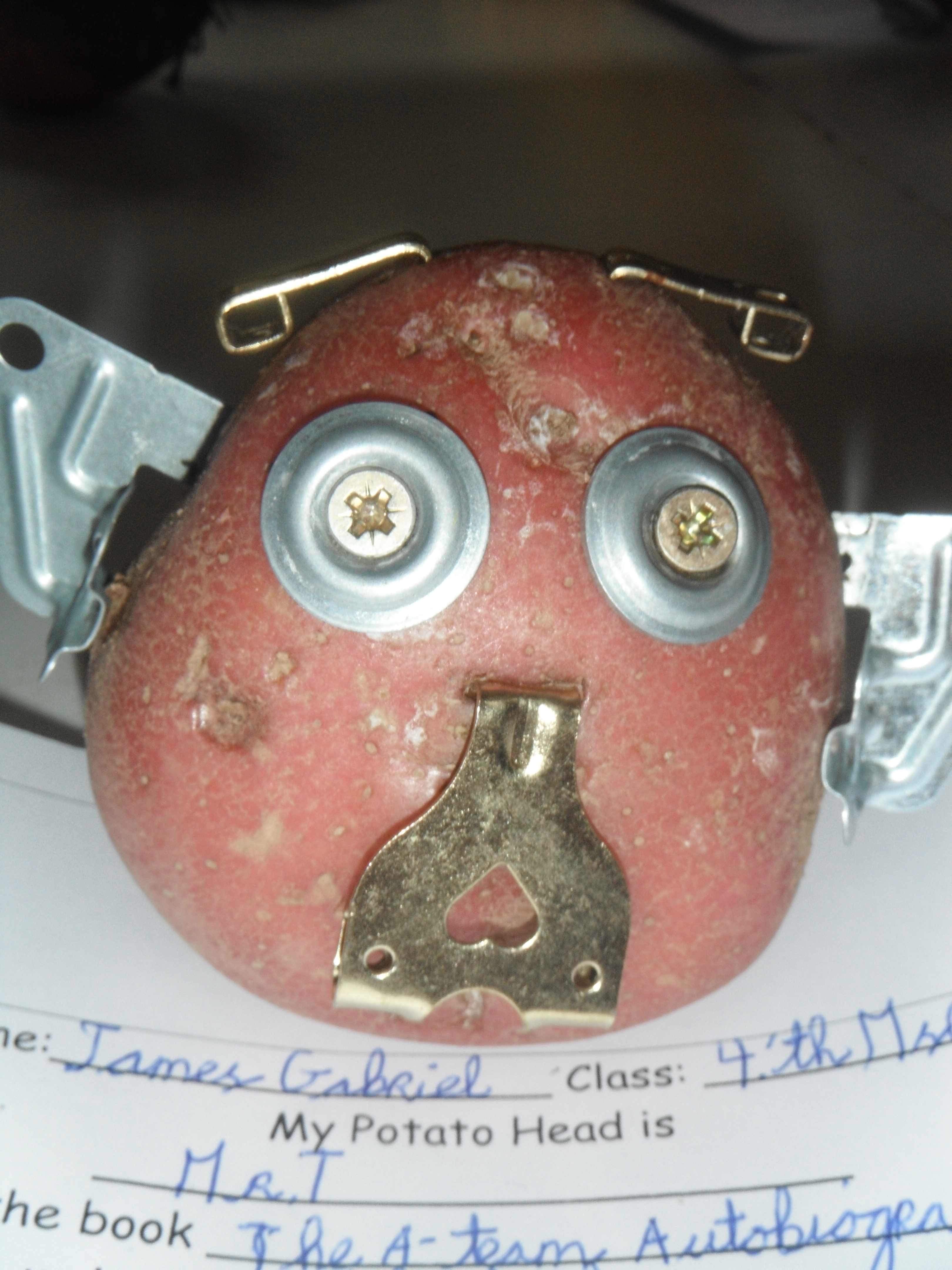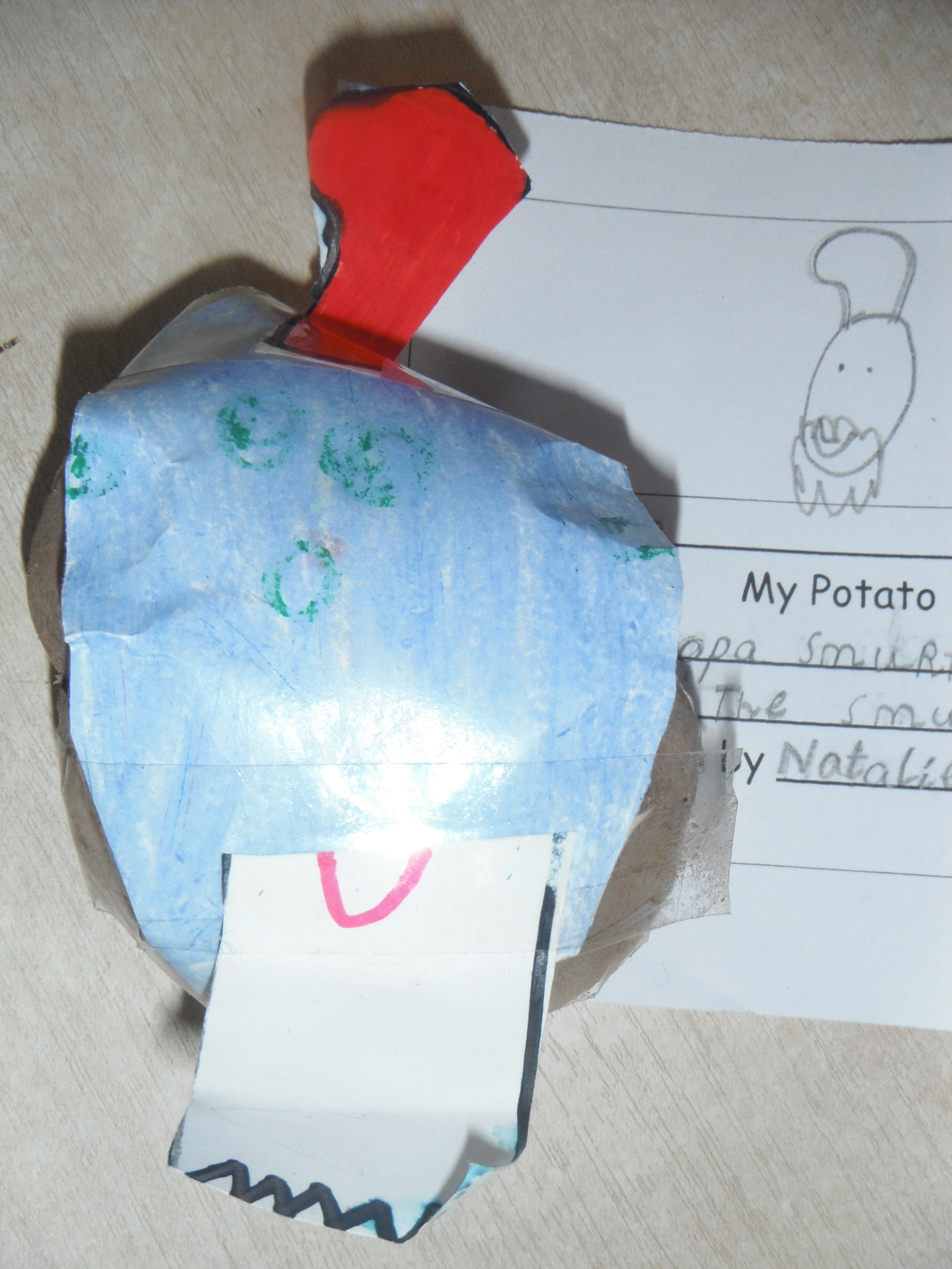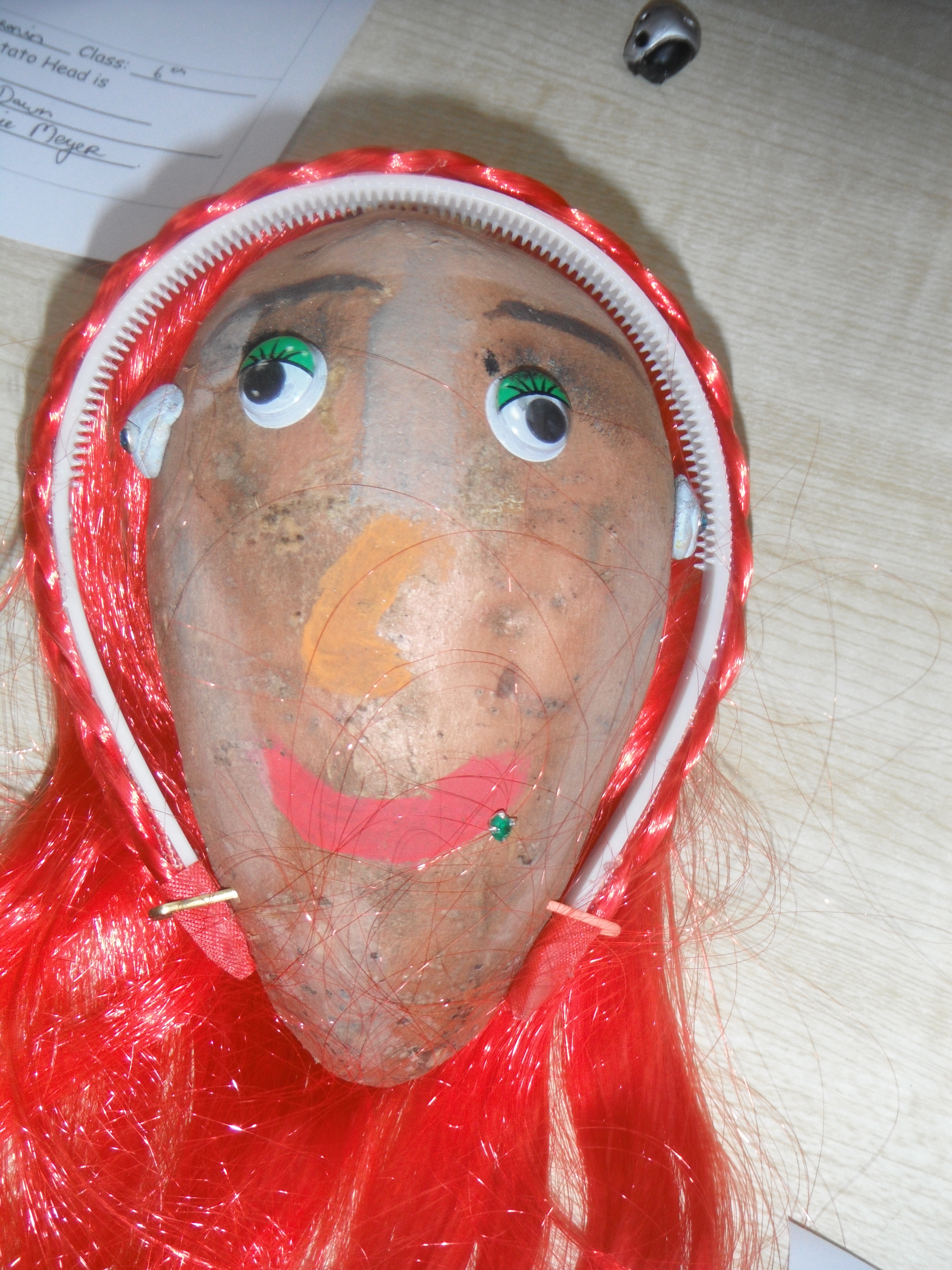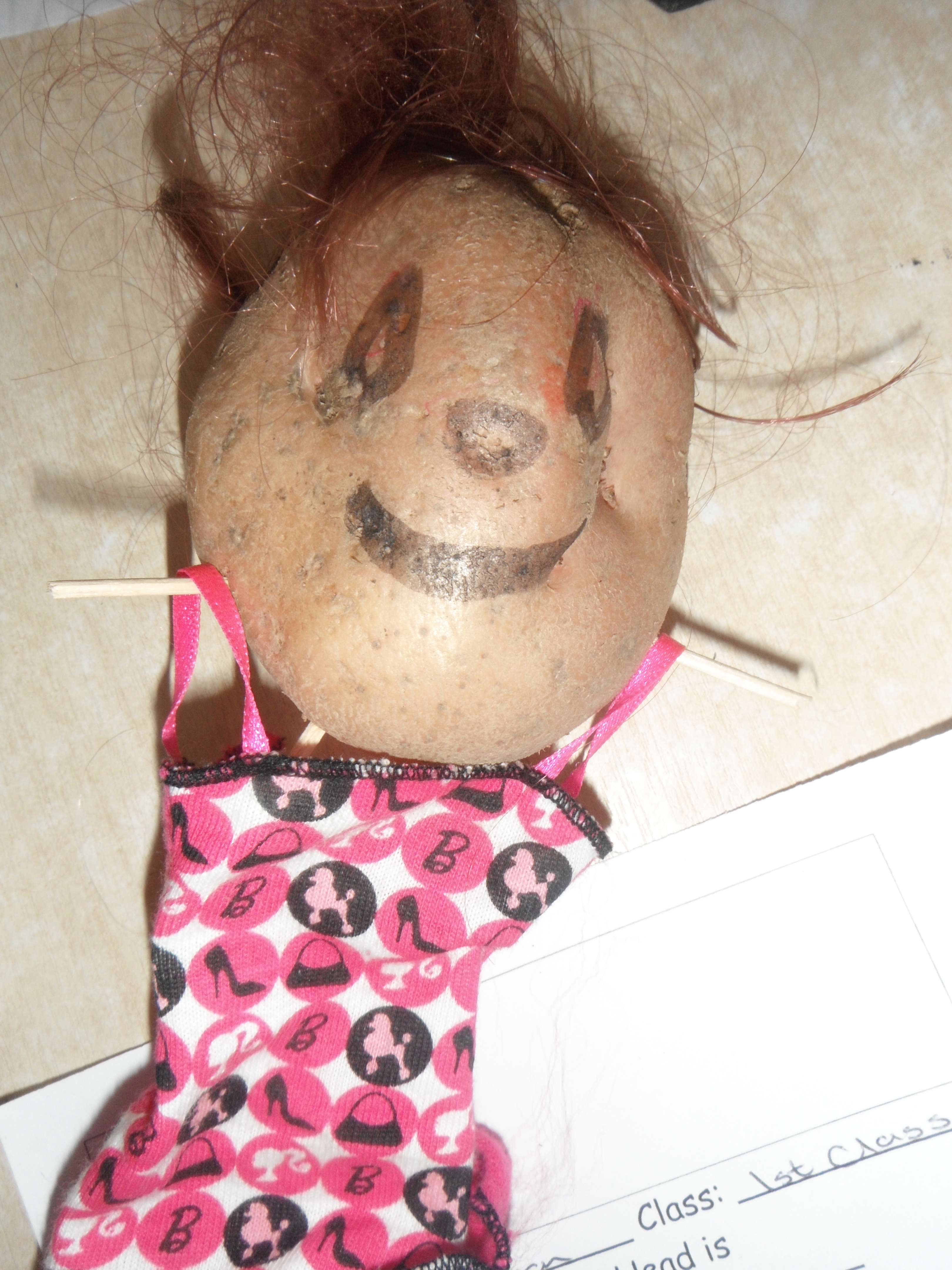 These are photographs of the fantastic potato head characters that children made this weekend and brought to school on Monday. All of the potato heads were made to resemble characters from a book. We had characters from fairytales, autobiographies, comic books and children’s novels. The display in the hall on Monday afternoon was wonderful. Every single potato head designer deserves a huge ‘WELL DONE!’ because these potatoes are absolutely amazing! Have a look…