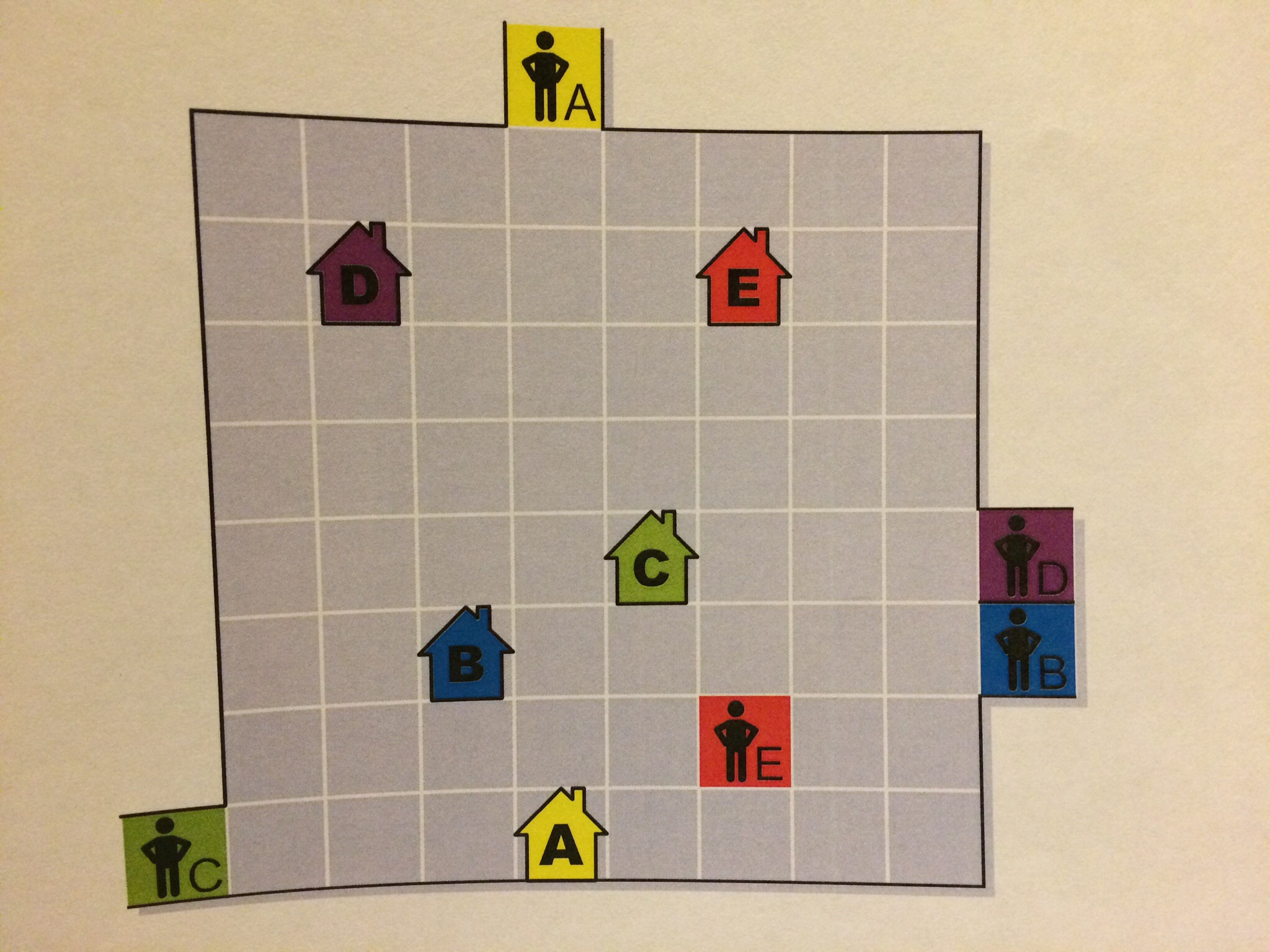 Each of the 5 men (A – E) need to get to their respective house. The problem is to discover how these five men can make these five routes without anyone crossing the route of another. In other words no more than one route is allowed through any box. The men are allowed to move vertically and horizontally but never diagonally. Can you solve this challenge?!