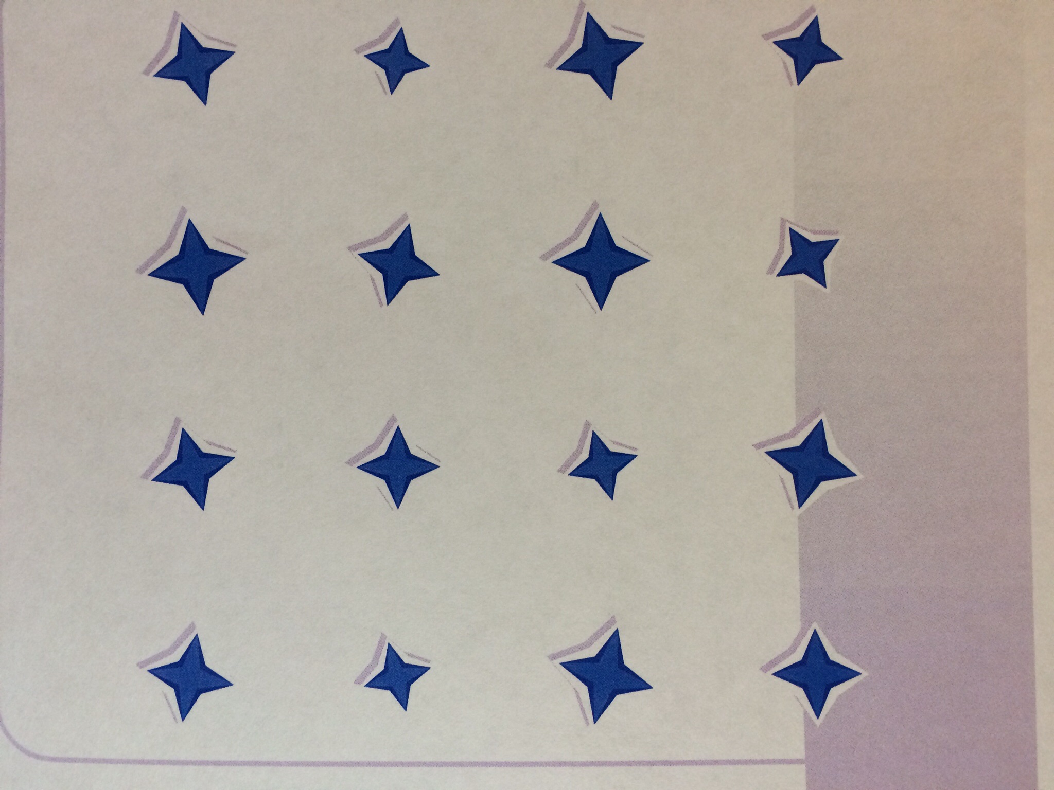 The object of this puzzle is to connect all sixteen stars above with exactly 6 connected straight lines…without lifting your pencil off the paper. The lines should go through the centre of each star.